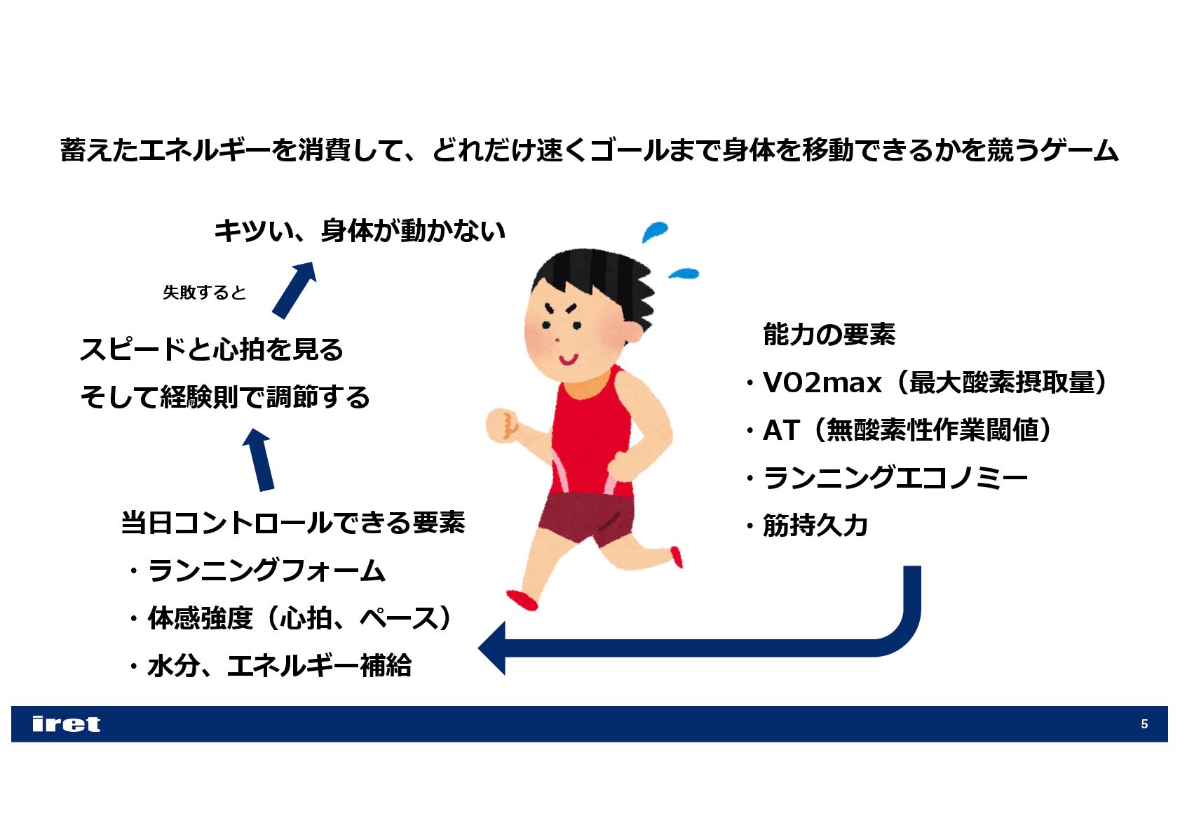 5 蓄えたエネルギーを消費して、どれだけ速くゴールまで⾝体を移動できるかを競うゲーム 能⼒の要素 ・VO2max(最⼤酸素摂取量) ・AT(無酸素性作業閾値) ・ランニングエコノミー ・筋持久⼒ 当⽇コントロールできる要素 ・ランニングフォーム ・体感強度(⼼拍、ペース)