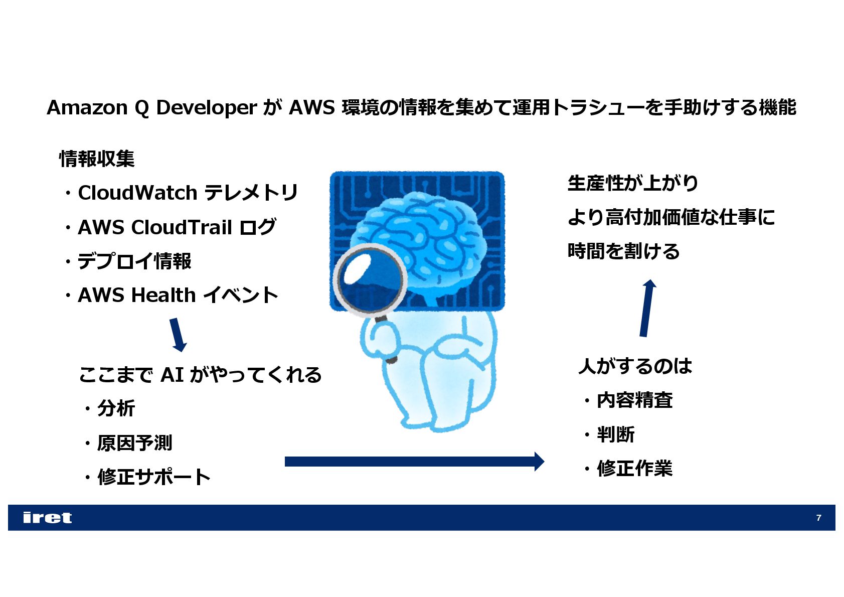 7 Amazon Q Developer が AWS 環境の情報を集めて運⽤トラシューを⼿助けする機能 ⽣産性が上がり より⾼付加価値な仕事に 時間を割ける