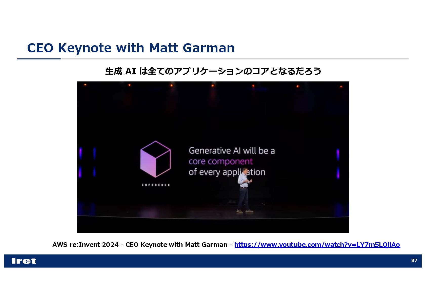 - https://www.youtube.com/watch?v=LY7m5LQliAo ⽣成 AI は全てのアプリケーションのコアとなるだろう CEO Keynote with Matt Garman