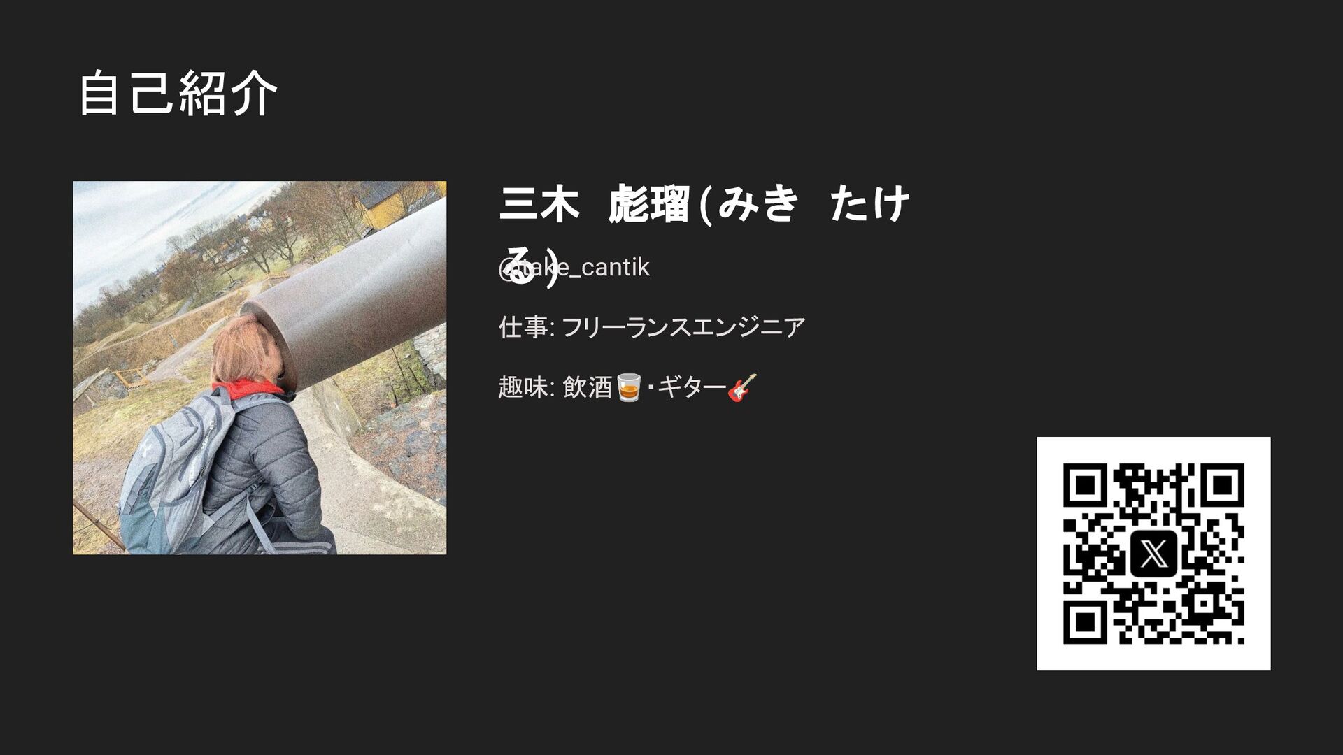 自己紹介 三木 彪瑠(みき たけ る) @take_cantik 仕事: フリーランスエンジニア 趣味: 飲酒🥃・ギター🎸