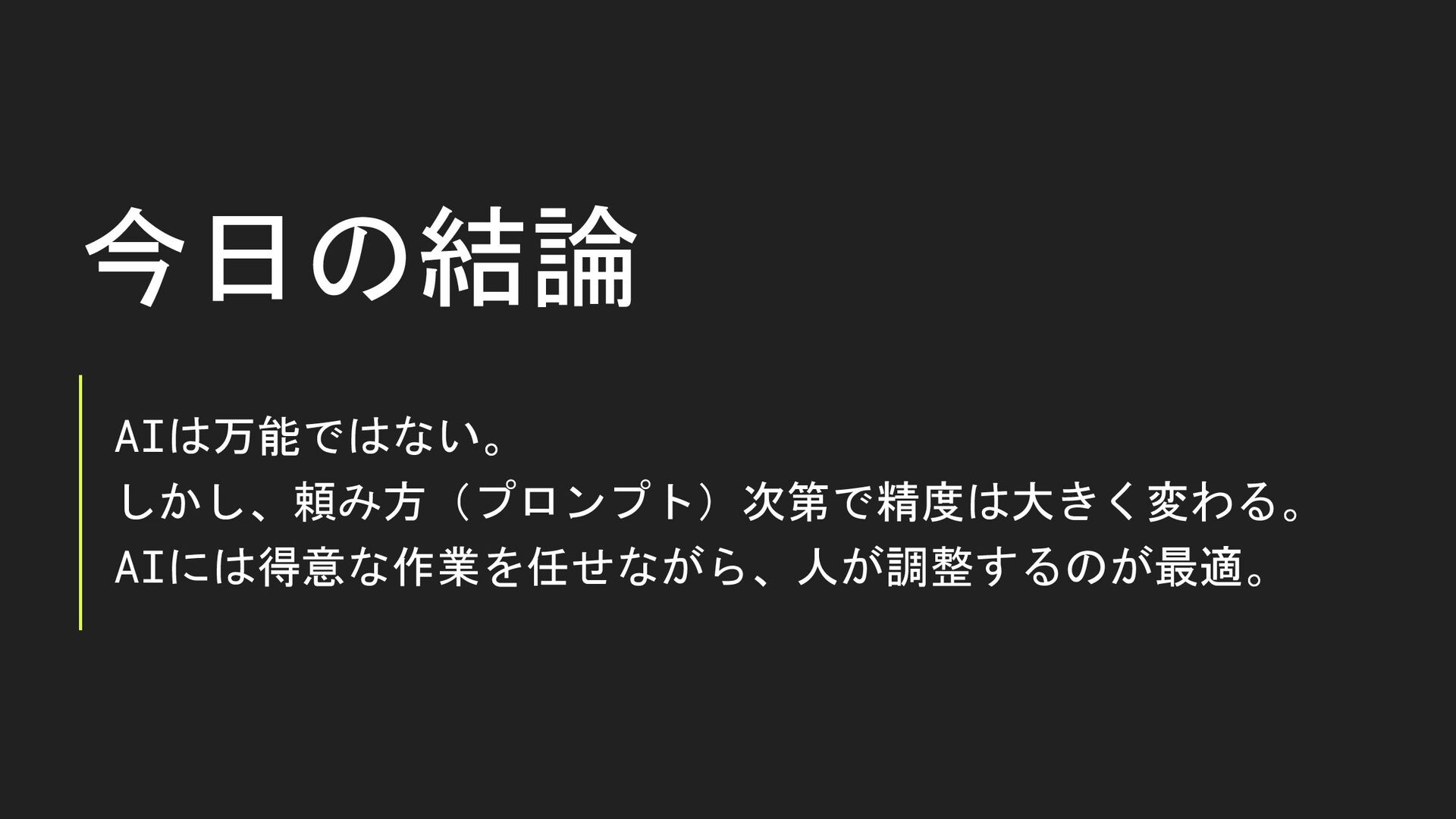 今日の結論 AIは万能ではない。 しかし、頼み方(プロンプト)次第で精度は大きく変わる。 AIには得意な作業を任せながら、人が調整するのが最適。