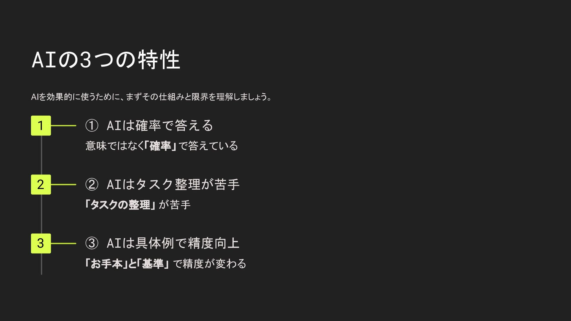 AIの3つの特性 AIを効果的に使うために、まずその仕組みと限界を理解しましょう。 1 ① AIは確率で答える 意味ではなく「確率」で答えている 2 ② AIはタスク整理が苦手 「タスクの整理」