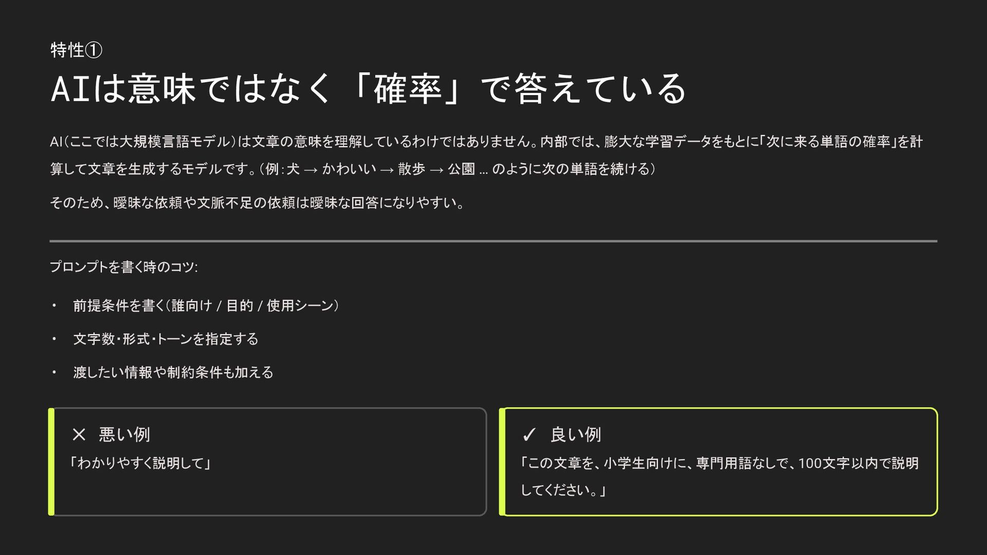 … のように次の単語を続ける) そのため、曖昧な依頼や文脈不足の依頼は曖昧な回答になりやすい。 プロンプトを書く時のコツ: • 前提条件を書く(誰向け / 目的 / 使用シーン) • 文字数・形式・トーンを指定する • 渡したい情報や制約条件も加える ✕ 悪い例 「わかりやすく説明して」 ✓ 良い例 「この文章を、小学生向けに、専門用語なしで、100文字以内で説明 してください。」