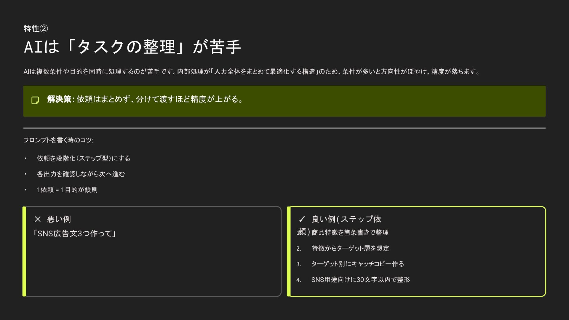 特性② AIは「タスクの整理」が苦手 AIは複数条件や目的を同時に処理するのが苦手です。内部処理が「入力全体をまとめて最適化する構造」のため、条件が多いと方向性がぼやけ、精度が落ちます。 解決策: 依頼はまとめず、分けて渡すほど精度が上がる。 プロンプトを書く時のコツ: • 依頼を段階化(ステップ型)にする • 各出力を確認しながら次へ進む