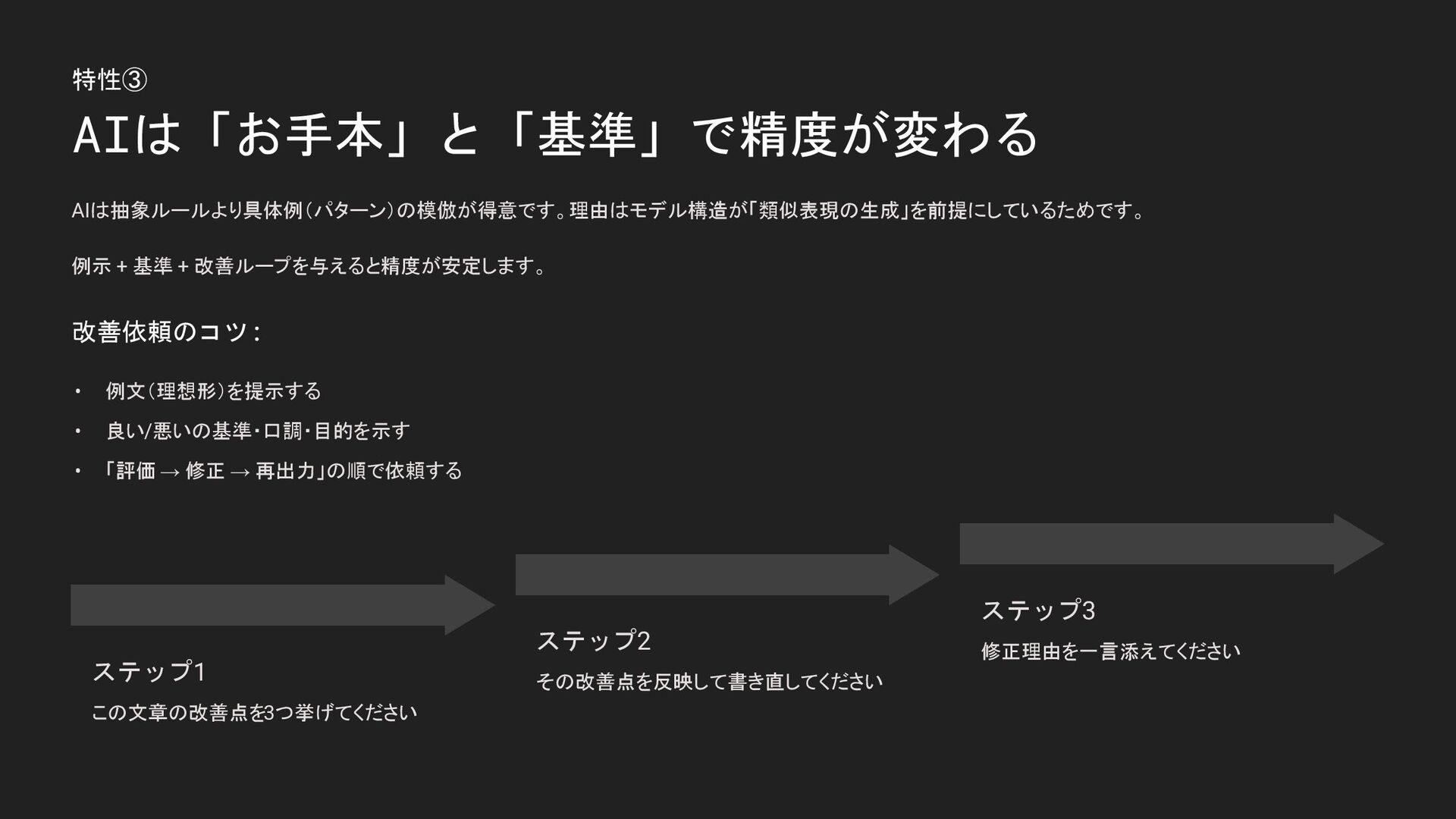 特性③ AIは「お手本」と「基準」で精度が変わる AIは抽象ルールより具体例(パターン)の模倣が得意です。理由はモデル構造が「類似表現の生成」を前提にしているためです。 例示 + 基準 + 改善ループを与えると精度が安定します。 改善依頼のコツ: •