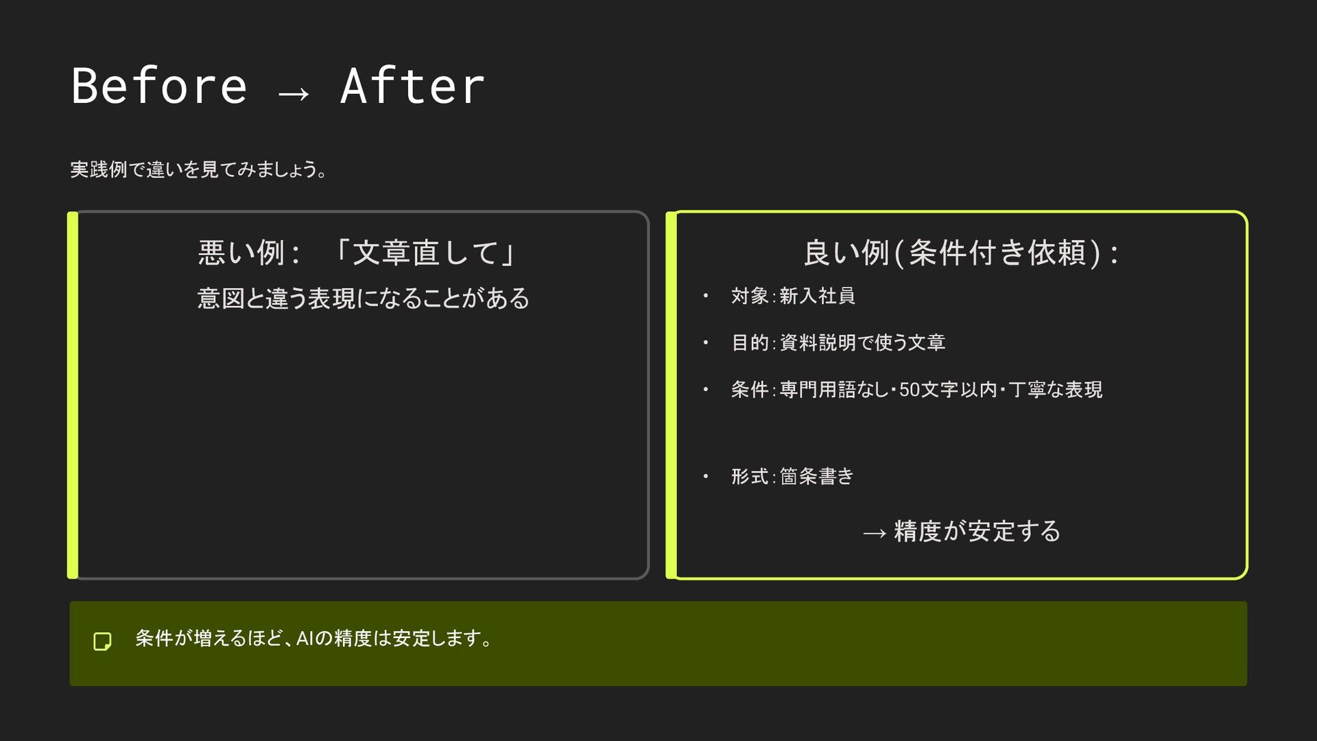 Before → After 実践例で違いを見てみましょう。 悪い例: 「文章直して」 意図と違う表現になることがある 良い例(条件付き依頼): • 対象:新入社員