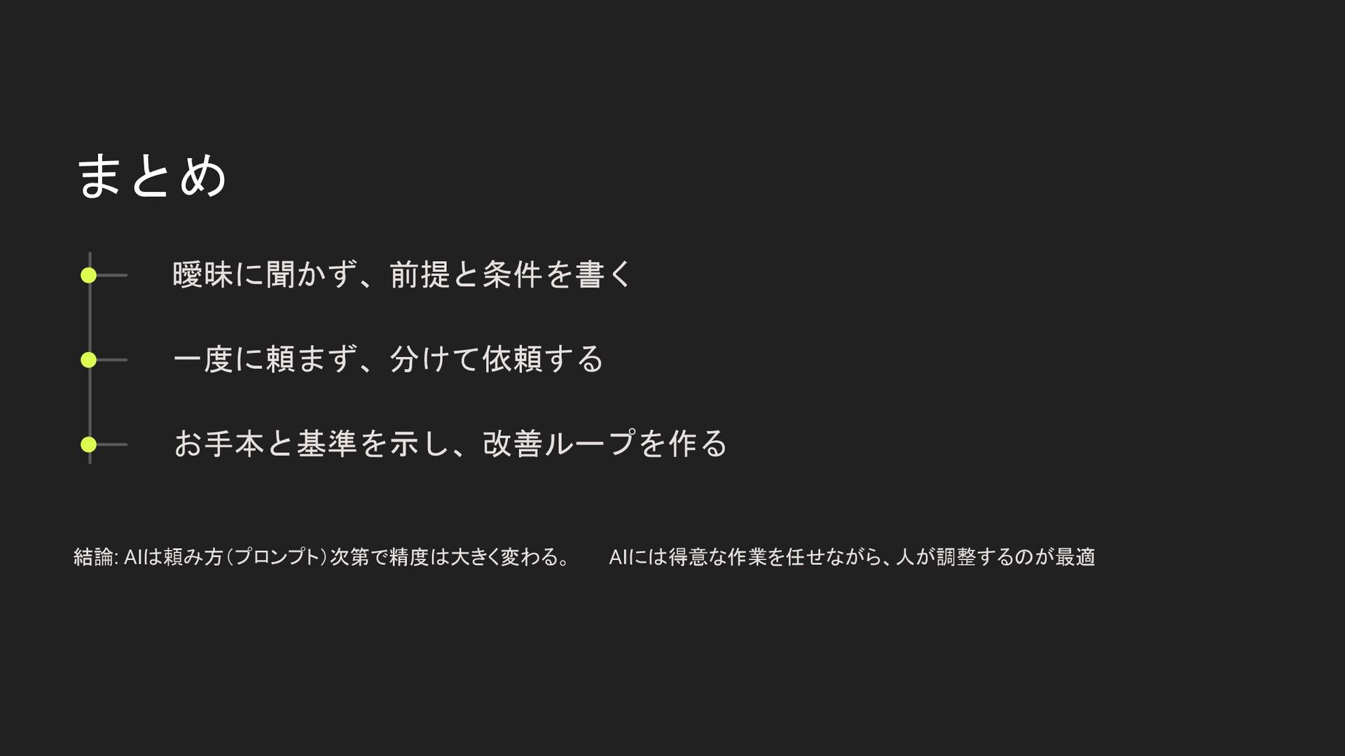 まとめ 曖昧に聞かず、前提と条件を書く 一度に頼まず、分けて依頼する お手本と基準を示し、改善ループを作る 結論: AIは頼み方(プロンプト)次第で精度は大きく変わる。 AIには得意な作業を任せながら、人が調整するのが最適