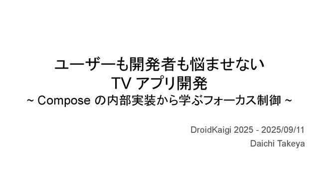 attach 先を発見する労力が必要 • attach する前に利用するとすぐクラッシュする (していた) ◦ Lazy Layout で陥りやすい 🕹 FocusRequester の取り扱いの難しさ • Experimental な機能が多く、挙動がすぐ変わる ◦ スクロールアニメーションが突如無視される ◦ Exception を throw していた処理が println になる • stable な機能もバグが放置されていたりする ◦ e.g.) LazyVerticalGrid でフォーカスが飛ぶ (link) 🐝 技術的な不安定性 扱いづらいところはあるものの 開発スピードの向上, バグ混入リスクの低減, 容易な機能拡張 など Compose for TV の導入で開発効率は向上した と感じてます