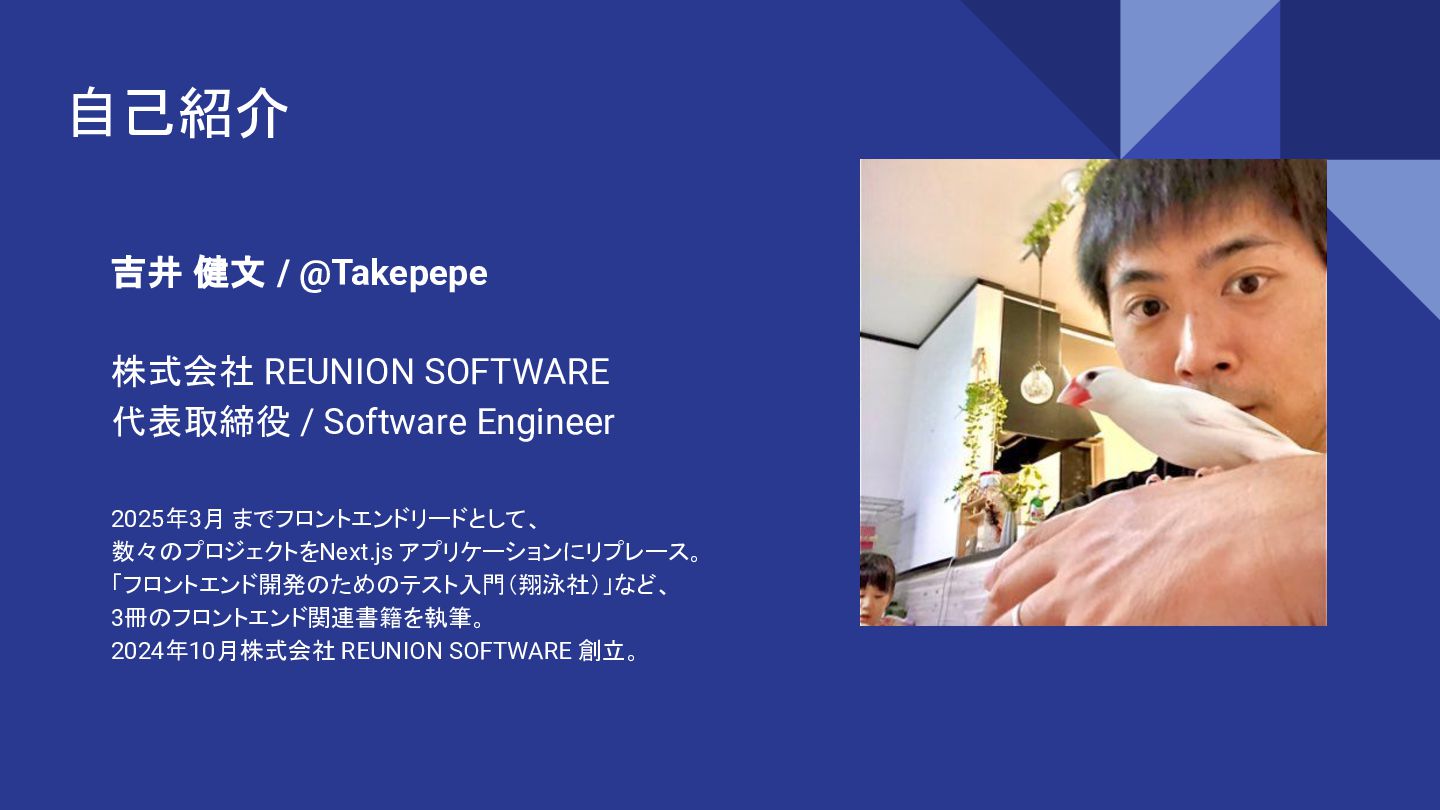 Software Engineer 2025年3月 までフロントエンドリードとして、 数々のプロジェクトをNext.js アプリケーションにリプレース。 「フロントエンド開発のためのテスト入門(翔泳社)」など、 3冊のフロントエンド関連書籍を執筆。 2024年10月株式会社 REUNION SOFTWARE 創立。