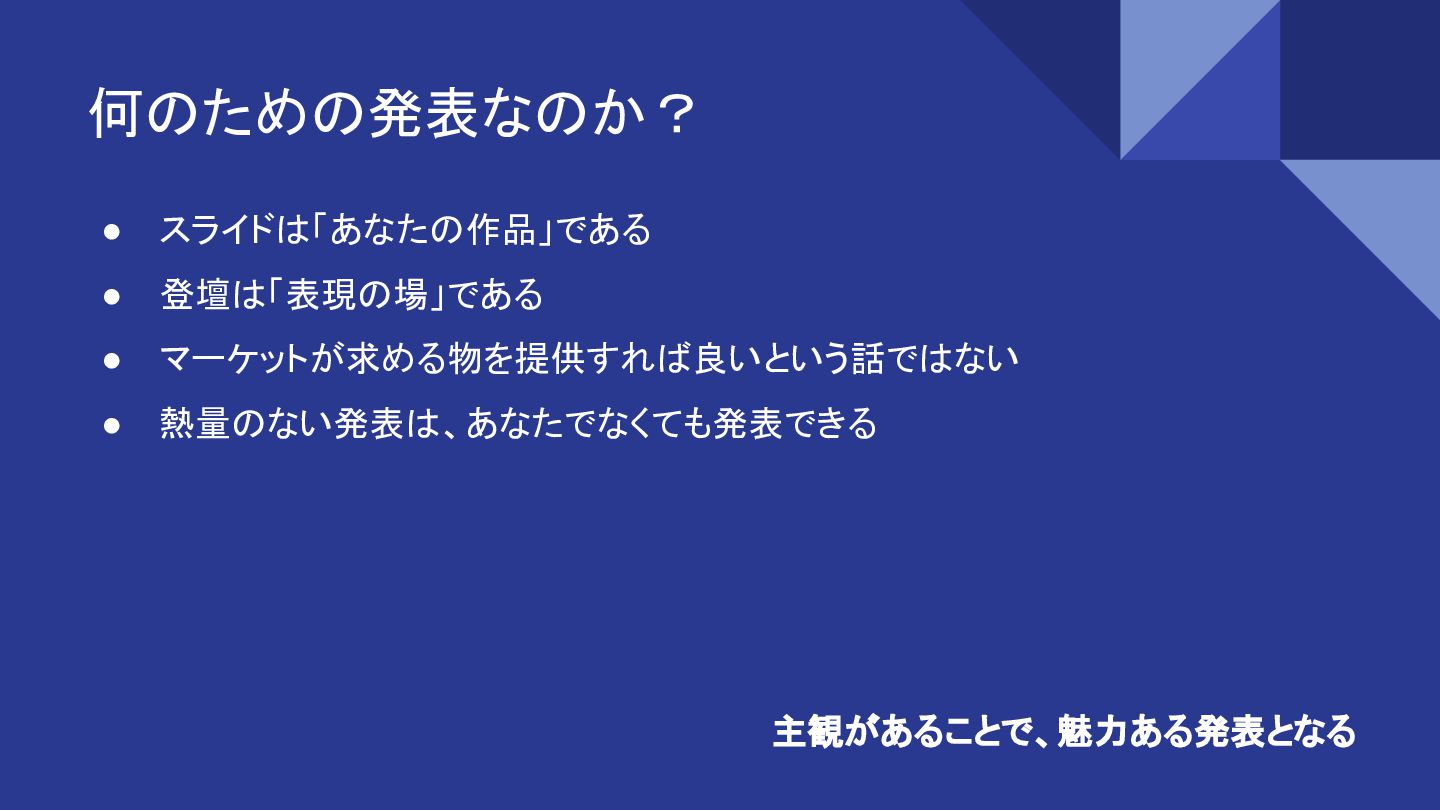 何のための発表なのか? • スライドは「あなたの作品」である • 登壇は「表現の場」である • マーケットが求める物を提供すれば良いという話ではない • 熱量のない発表は、あなたでなくても発表できる 主観があることで、魅力ある発表となる