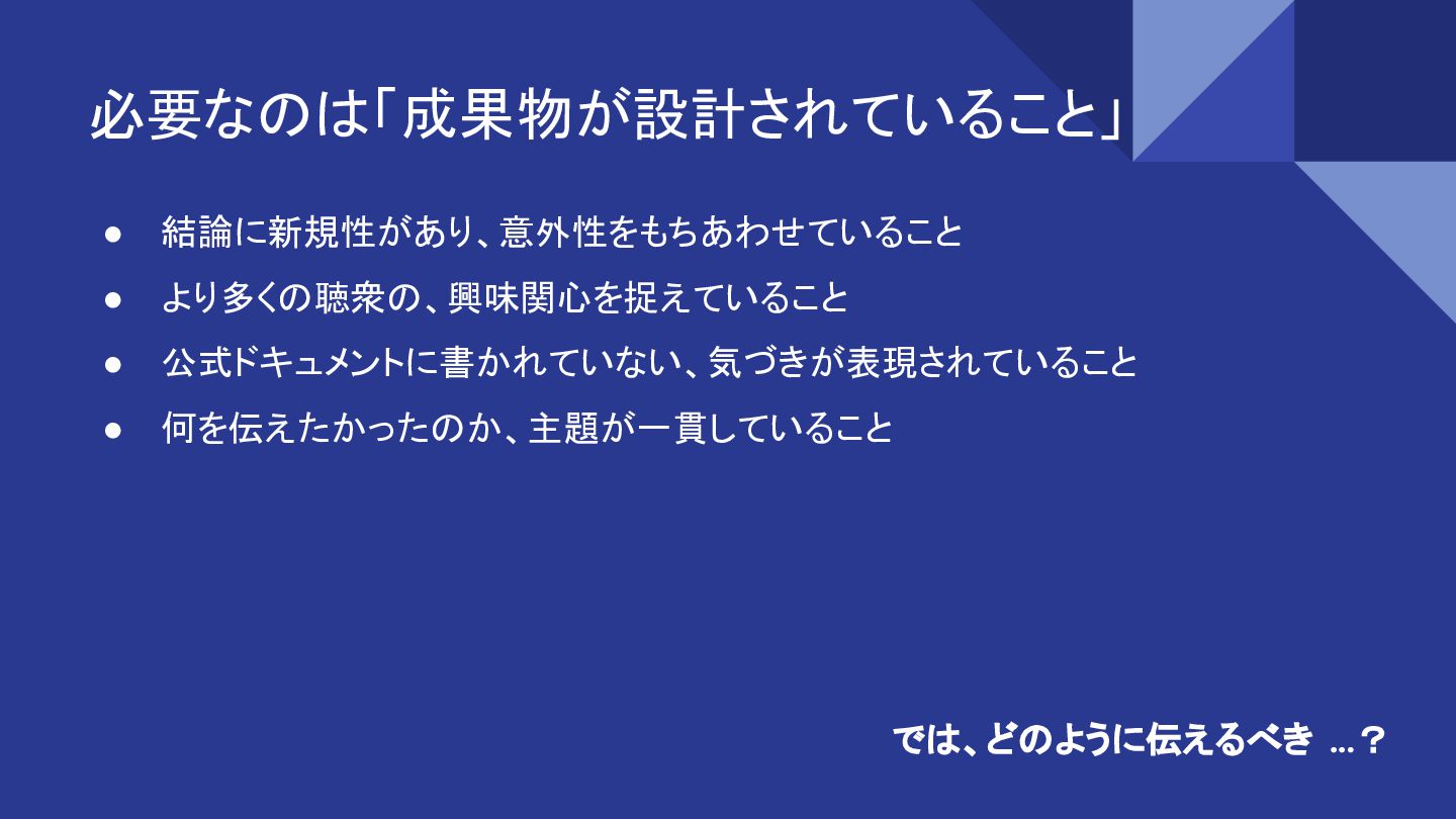 必要なのは「成果物が設計されていること」 • 結論に新規性があり、意外性をもちあわせていること • より多くの聴衆の、興味関心を捉えていること • 公式ドキュメントに書かれていない、気づきが表現されていること • 何を伝えたかったのか、主題が一貫していること では、どのように伝えるべき