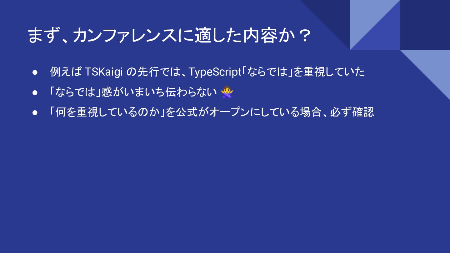 まず、カンファレンスに適した内容か? • 例えば TSKaigi の先行では、TypeScript「ならでは」を重視していた • 「ならでは」感がいまいち伝わらない • 「何を重視しているのか」を公式がオープンにしている場合、必ず確認