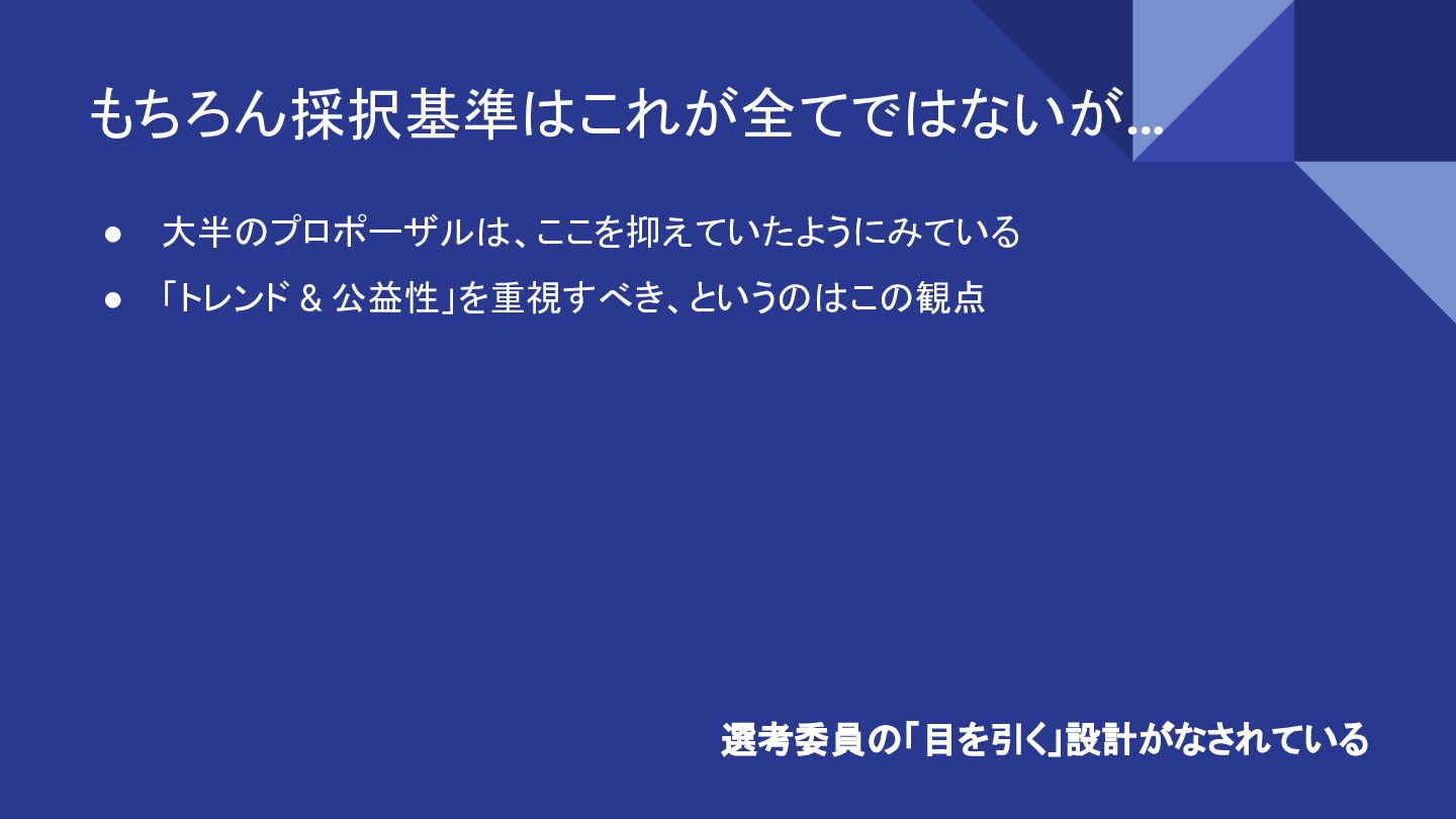 もちろん採択基準はこれが全てではないが… • 大半のプロポーザルは、ここを抑えていたようにみている • 「トレンド & 公益性」を重視すべき、というのはこの観点 選考委員の「目を引く」設計がなされている
