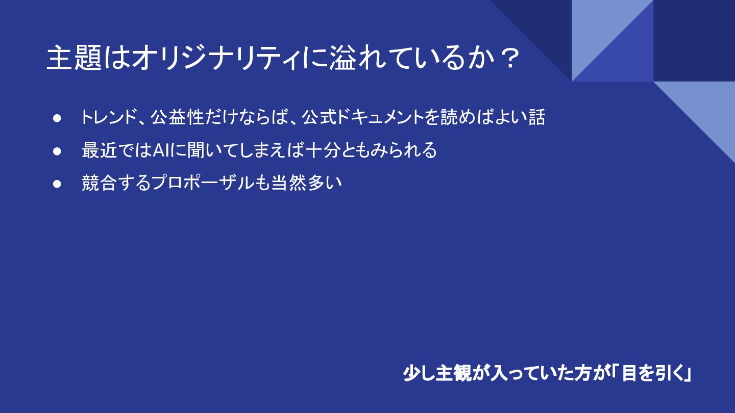主題はオリジナリティに溢れているか? • トレンド、公益性だけならば、公式ドキュメントを読めばよい話 • 最近ではAIに聞いてしまえば十分ともみられる • 競合するプロポーザルも当然多い 少し主観が入っていた方が「目を引く」