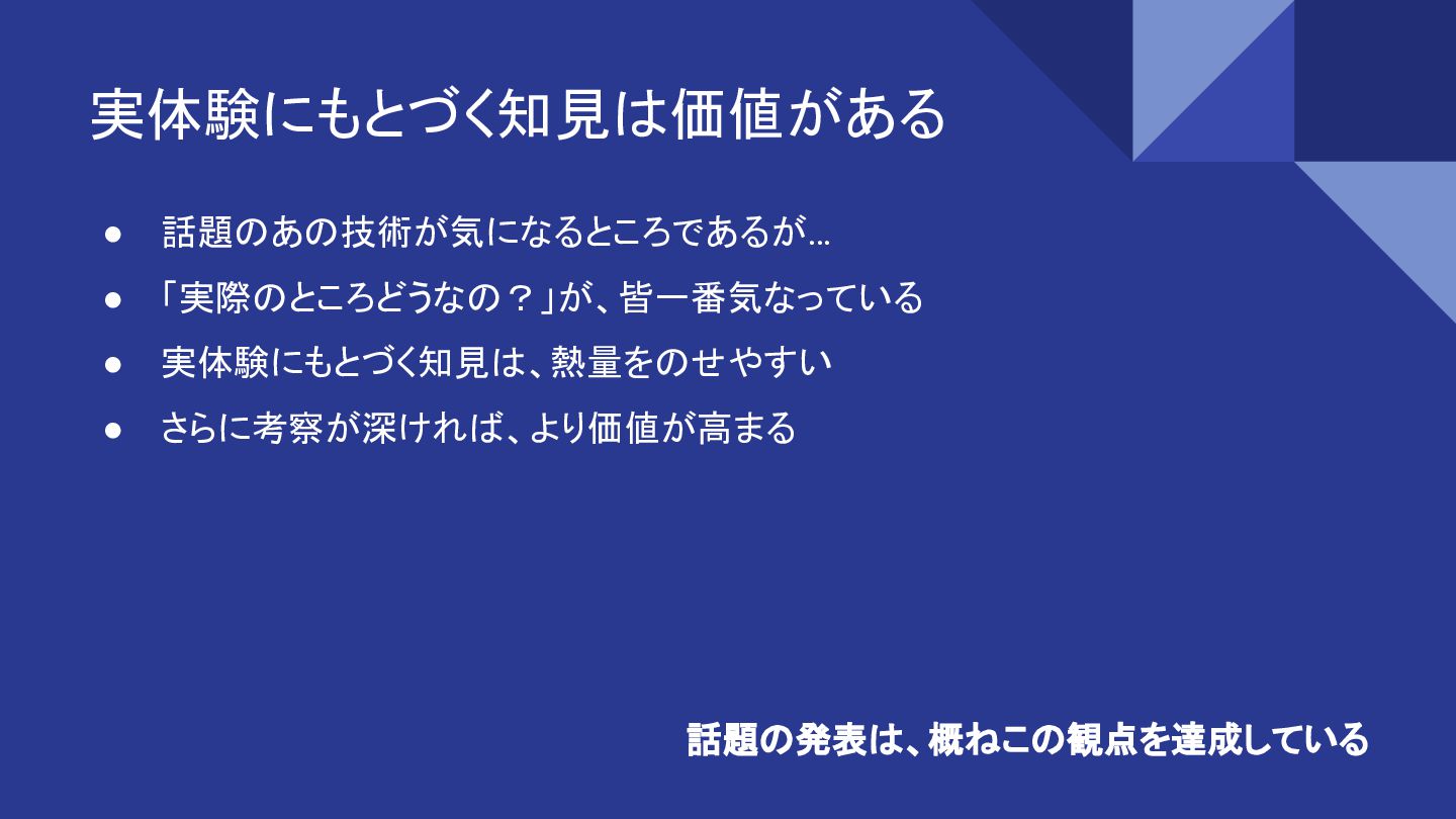 実体験にもとづく知見は価値がある • 話題のあの技術が気になるところであるが… • 「実際のところどうなの?」が、皆一番気なっている • 実体験にもとづく知見は、熱量をのせやすい • さらに考察が深ければ、より価値が高まる 話題の発表は、概ねこの観点を達成している