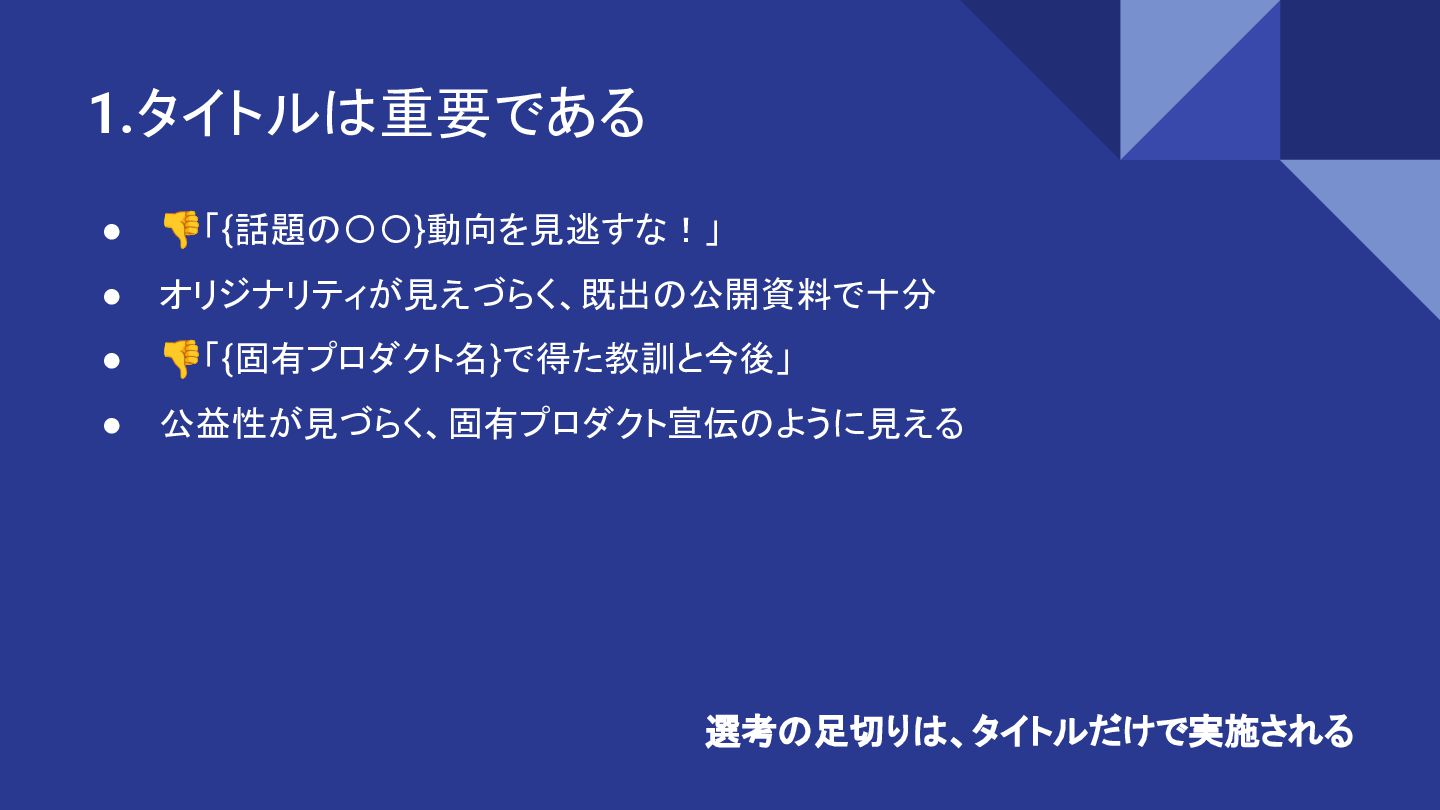 1.タイトルは重要である • 👎「{話題の〇〇}動向を見逃すな!」 • オリジナリティが見えづらく、既出の公開資料で十分 • 👎「{固有プロダクト名}で得た教訓と今後」 • 公益性が見づらく、固有プロダクト宣伝のように見える 選考の足切りは、タイトルだけで実施される