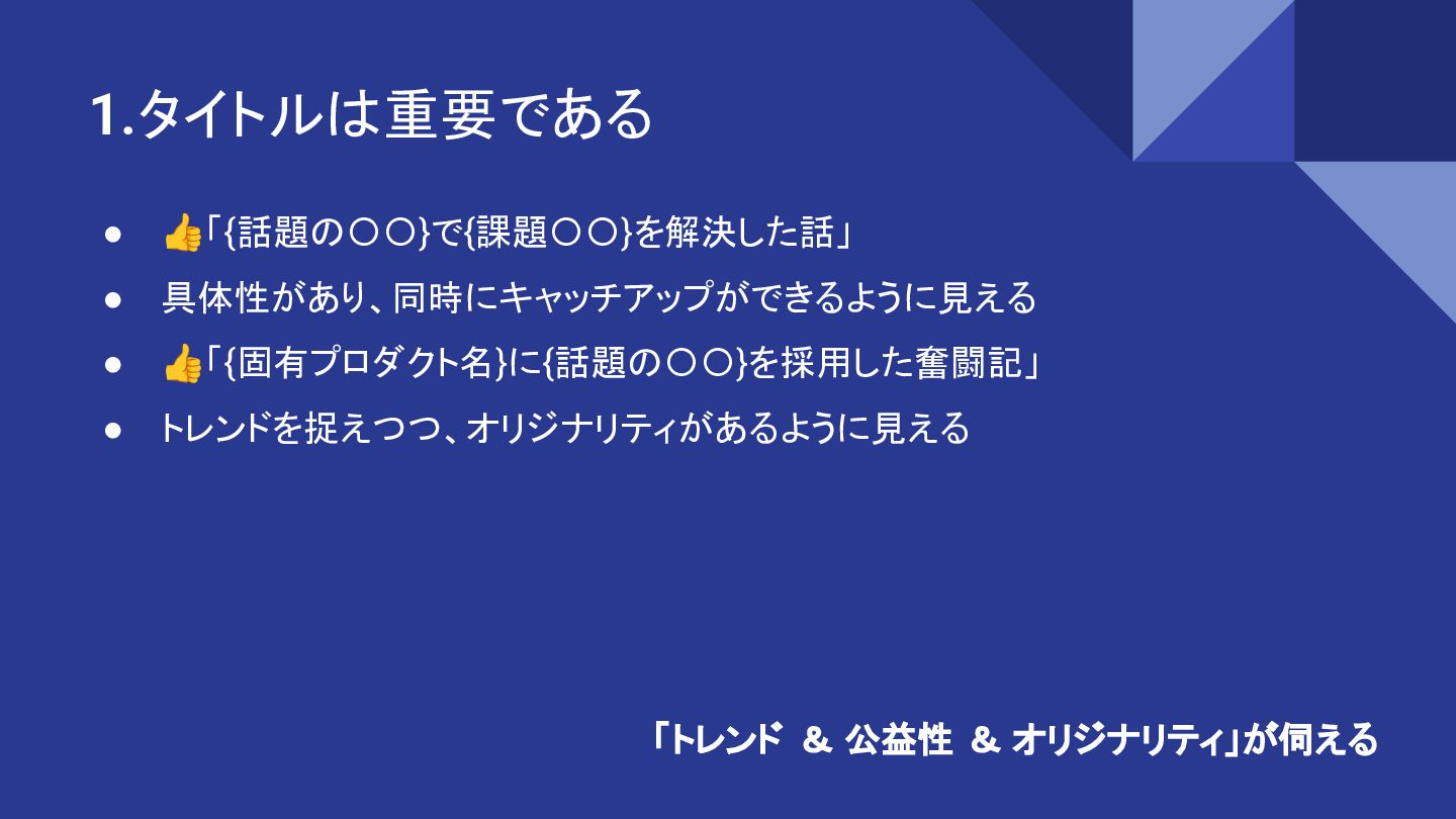 1.タイトルは重要である • 👍「{話題の〇〇}で{課題〇〇}を解決した話」 • 具体性があり、同時にキャッチアップができるように見える • 👍「{固有プロダクト名}に{話題の〇〇}を採用した奮闘記」 • トレンドを捉えつつ、オリジナリティがあるように見える 「トレンド