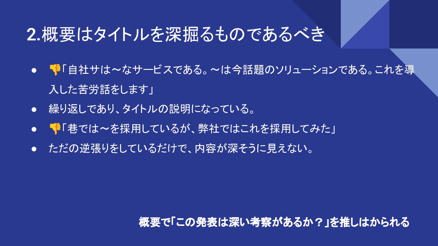 2.概要はタイトルを深掘るものであるべき • 👎「自社サは〜なサービスである。〜は今話題のソリューションである。これを導 入した苦労話をします」 • 繰り返しであり、タイトルの説明になっている。 • 👎「巷では〜を採用しているが、弊社ではこれを採用してみた」 • ただの逆張りをしているだけで、内容が深そうに見えない。