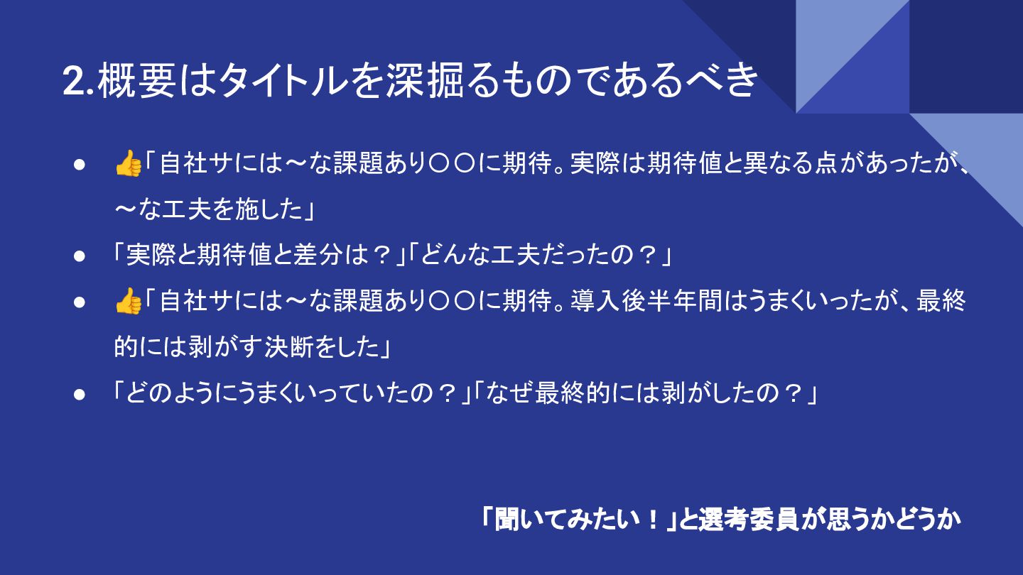 2.概要はタイトルを深掘るものであるべき • 👍「自社サには〜な課題あり〇〇に期待。実際は期待値と異なる点があったが、 〜な工夫を施した」 • 「実際と期待値と差分は?」「どんな工夫だったの?」 • 👍「自社サには〜な課題あり〇〇に期待。導入後半年間はうまくいったが、最終 的には剥がす決断をした」 •
