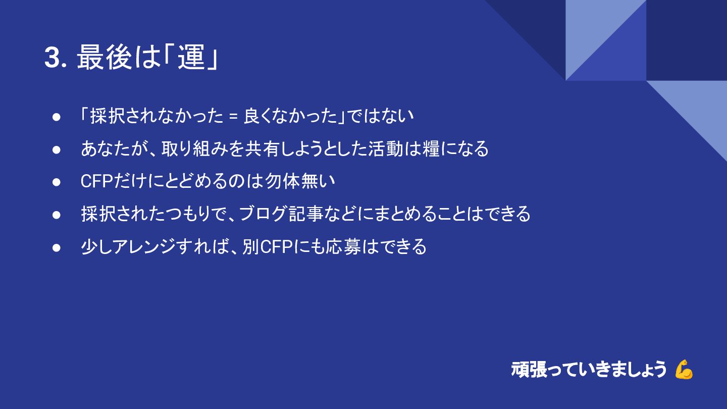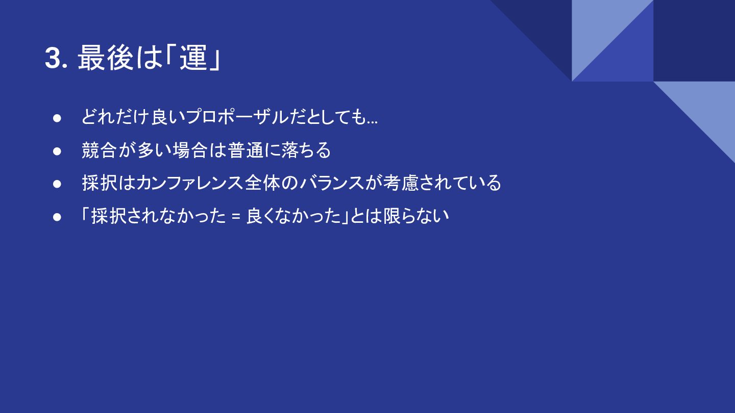 3. 最後は「運」 • どれだけ良いプロポーザルだとしても… • 競合が多い場合は普通に落ちる • 採択はカンファレンス全体のバランスが考慮されている • 「採択されなかった