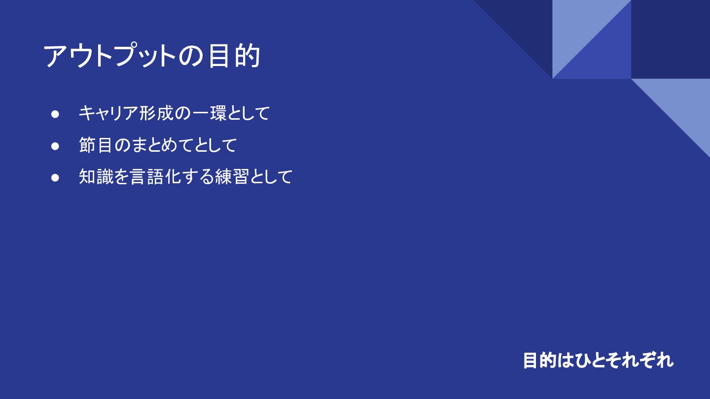 アウトプットの目的 • キャリア形成の一環として • 節目のまとめてとして • 知識を言語化する練習として 目的はひとそれぞれ