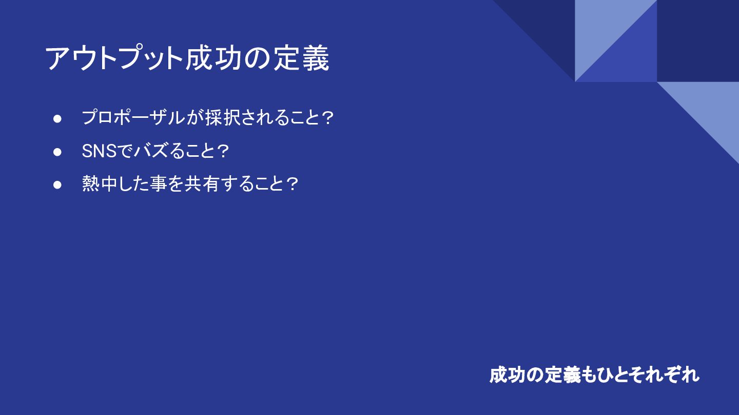 アウトプット成功の定義 • プロポーザルが採択されること? • SNSでバズること? • 熱中した事を共有すること? 成功の定義もひとそれぞれ