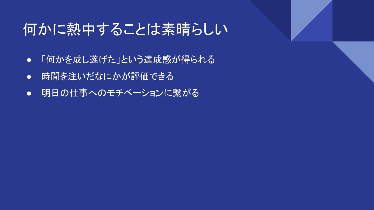 何かに熱中することは素晴らしい • 「何かを成し遂げた」という達成感が得られる • 時間を注いだなにかが評価できる • 明日の仕事へのモチベーションに繋がる