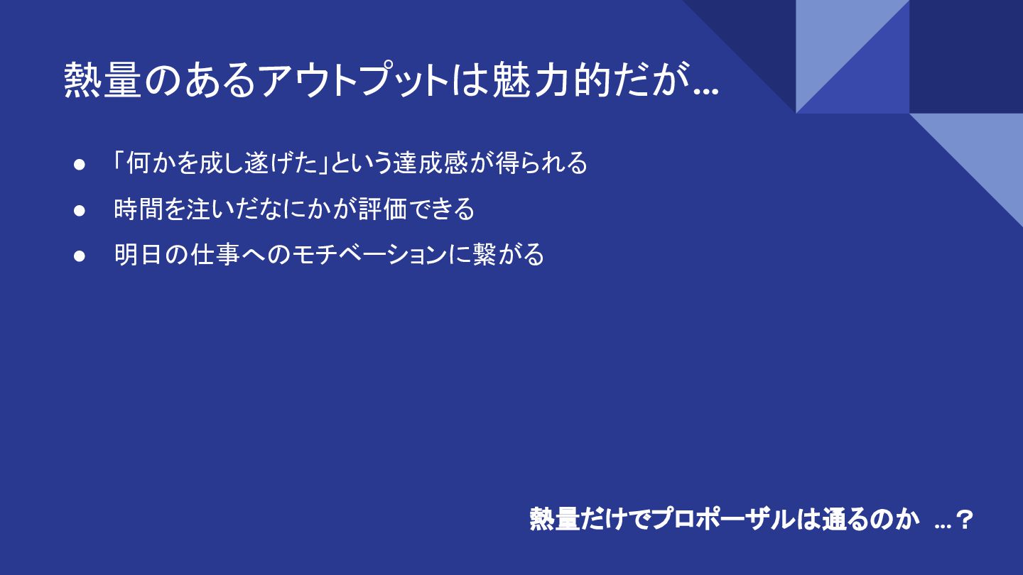 熱量のあるアウトプットは魅力的だが… • 「何かを成し遂げた」という達成感が得られる • 時間を注いだなにかが評価できる • 明日の仕事へのモチベーションに繋がる 熱量だけでプロポーザルは通るのか …?