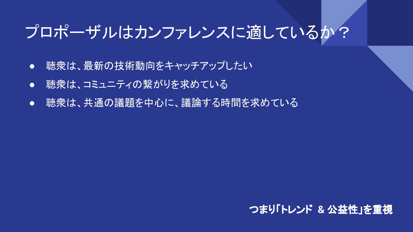 プロポーザルはカンファレンスに適しているか? • 聴衆は、最新の技術動向をキャッチアップしたい • 聴衆は、コミュニティの繋がりを求めている • 聴衆は、共通の議題を中心に、議論する時間を求めている つまり「トレンド & 公益性」を重視