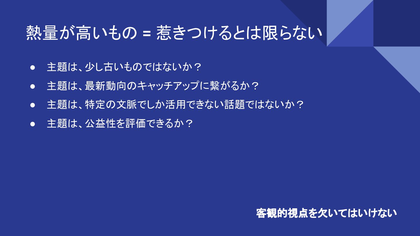 熱量が高いもの = 惹きつけるとは限らない • 主題は、少し古いものではないか? • 主題は、最新動向のキャッチアップに繋がるか? • 主題は、特定の文脈でしか活用できない話題ではないか? •