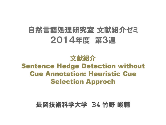 Cue Annotation : A Heuristic Cue Selection Approach. J. Nat. Lang. Process. 21, 27–40 (2014). 概要(*引用): This paper present a simple yet effective approch to sentence- level uncertainty detection which does not rewuire cue word annotation. Unlike previous works, the proposed method focuses on cue selection, decoupling it from disambiguation and by optimizing it over sentence hedgin error rate. High perfomance for the task is achieved in experiments, even for settings with poor disambiguation, without cue annotaion and with otherwise unreliable corpora from a machine learning point-of-view. キーワード:Hedge Detection, Text Mining 文献紹介:Sentence Hedge Detection without Cue Annotation: Aheuristic Cue Selection Approch 2014/4/17 長岡技術科学大学 自然言語処理研究室 2014年度 文献紹介ゼミ