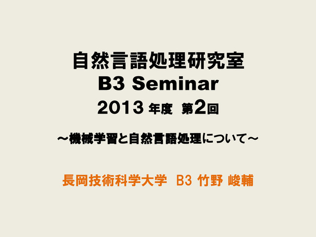 自然言語処理研究室 B3 Seminar 2013 年度 第2回 ~機械学習と自然言語処理について~ 長岡技術科学大学 B3 竹野