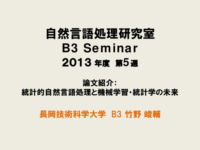 自然言語処理研究室 B3 Seminar 2013 年度 第5週 論文紹介: 統計的自然言語処理と機械学習・統計学の未来 長岡技術科学大学 B3