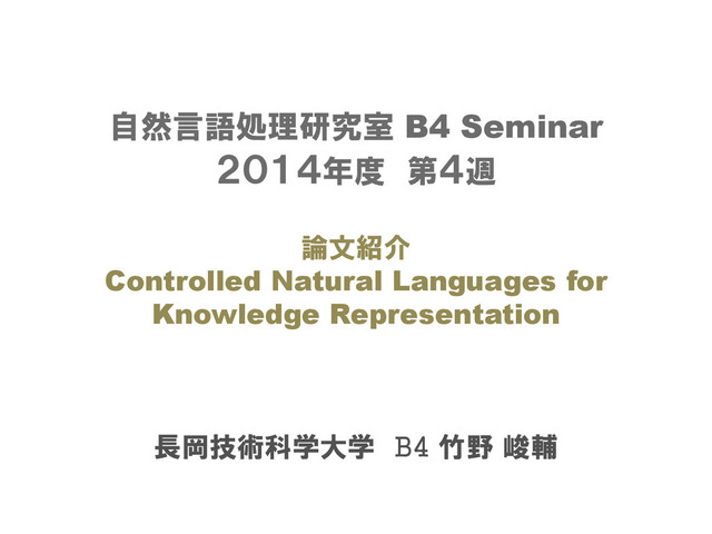 Proceedings of the 23rd International Conference on Computational Linguistics: Posters, 2010, no. August, pp. 1113–1121. • Abstract: This paper presents a survey of research in controlled natural languages that can be used as high-level knowledge representa- tion languages. Over the past 10 years or so, a number of machine-oriented con- trolled natural languages have emerged that can be used as high-level interface languages to various kinds of knowledge systems. These languages are relevant to the area of computational linguistics since they have two very interesting properties: firstly, they look informal like natural lan- guages and are therefore easier to write and understand by humans than formal languages; secondly, they are precisely defined subsets of natural languages and can be translated automatically (and often deterministically) into a formal target lan- guage and then be used for automated rea- soning. We present and compare the most mature of these novel languages, show how they can balance the disadvantages of natural languages and formal languages for knowledge representation, and discuss how domain specialists can be supported writing specifications in controlled natural language. 2014/3/14 長岡技術科学大学 自然言語処理研究室 2014年度 B4ゼミ Controlled Natural Languages for Knowledge Representation