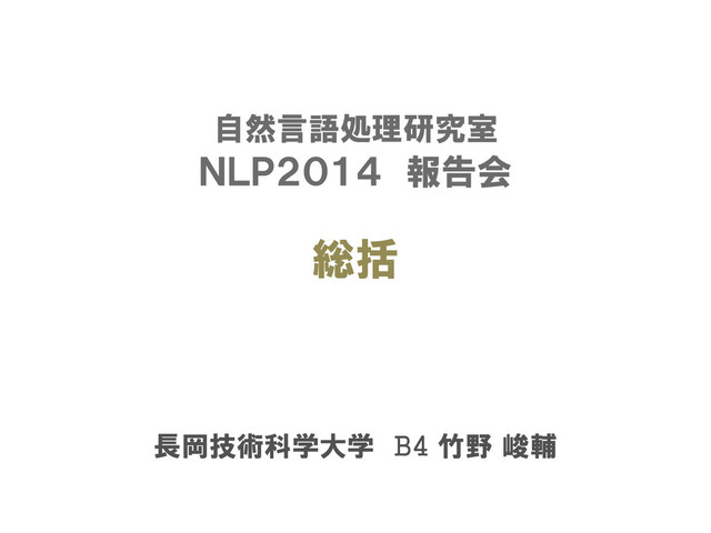 pp. 1063–1066. Jun Suzuki and Masaaki Nagata. Supervised model learning with feature grouping based on a discrete constraint. In Proceedings of the 51st Annual Meeting of the Association for Computational Linguistics (Volume 2: Short Papers), pages 18–23, Sofia, Bulgaria, August 2013. Association for Computa- tional Linguistics. A7:機械学習, 3/20(木) 他 受賞者多 • 村岡雅康, 島岡聖世, 山本風人, 渡邉陽太郎, 岡崎直観, and 乾健太郎, “係り受け関 係を用いた句ベクトルの生成,” in 言語処理学会 第20回年次大会 発表論文集, 2014, no. C, pp. 1055–1058. • 島岡聖世, 村岡雅康, 山本風人, 渡邉陽太郎, 岡崎直観, and 乾健太郎, “ガウス分 布による単語と句の意味の分布的表現,” 言語処理学会 第20回年次大会 発表論文 集, pp. 1051–1054, 2014. 2014/3/25 長岡技術科学大学 自然言語処理研究室 2014年度 B4ゼミ 文献紹介