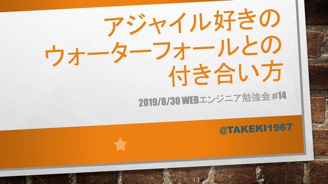 たけき @TAKEKI1967 •1991/4~2015/9 会社員 •ソフトウェア生産技術 •2015/10~ フリーランス •企業常駐型 •ruby on