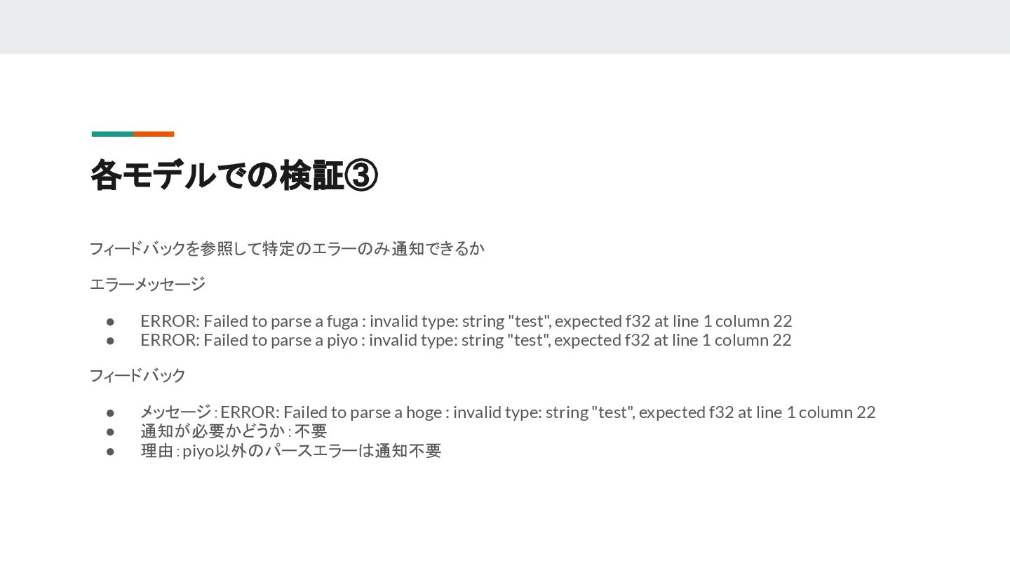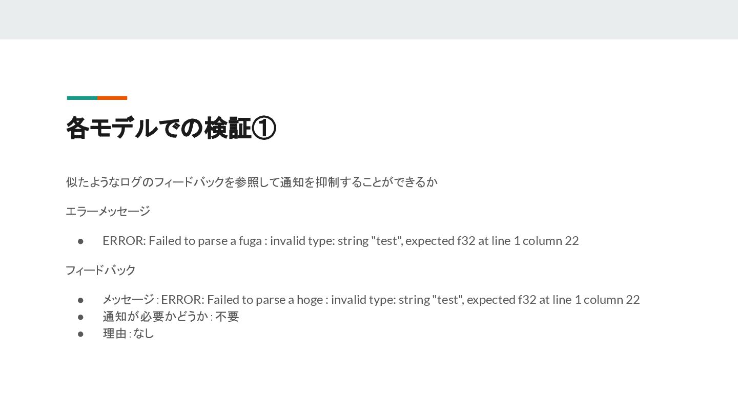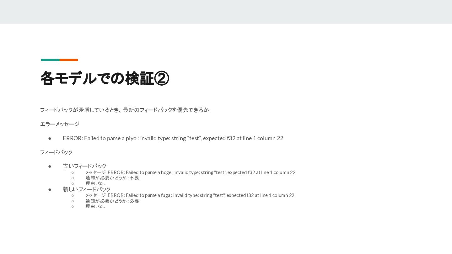 : invalid type: string "test", expected f32 at line 1 column 22 フィードバック • 古いフィードバック ◦ メッセージ:ERROR: Failed to parse a hoge : invalid type: string "test", expected f32 at line 1 column 22 ◦ 通知が必要かどうか:不要 ◦ 理由:なし • 新しいフィードバック ◦ メッセージ:ERROR: Failed to parse a fuga : invalid type: string "test", expected f32 at line 1 column 22 ◦ 通知が必要かどうか:必要 ◦ 理由:なし