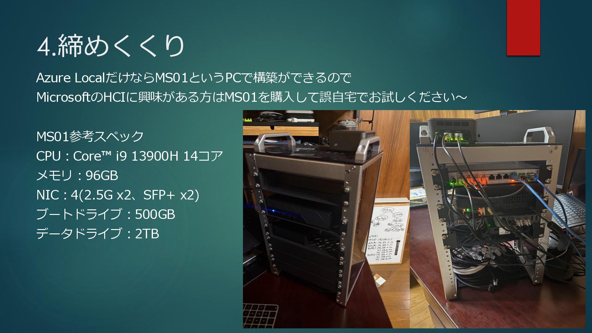 4.締めくくり Azure LocalだけならMS01というPCで構築ができるので MicrosoftのHCIに興味がある方はMS01を購入して誤自宅でお試しください〜 MS01参考スペック CPU:Core i9 13900H 14コア メモリ:96GB