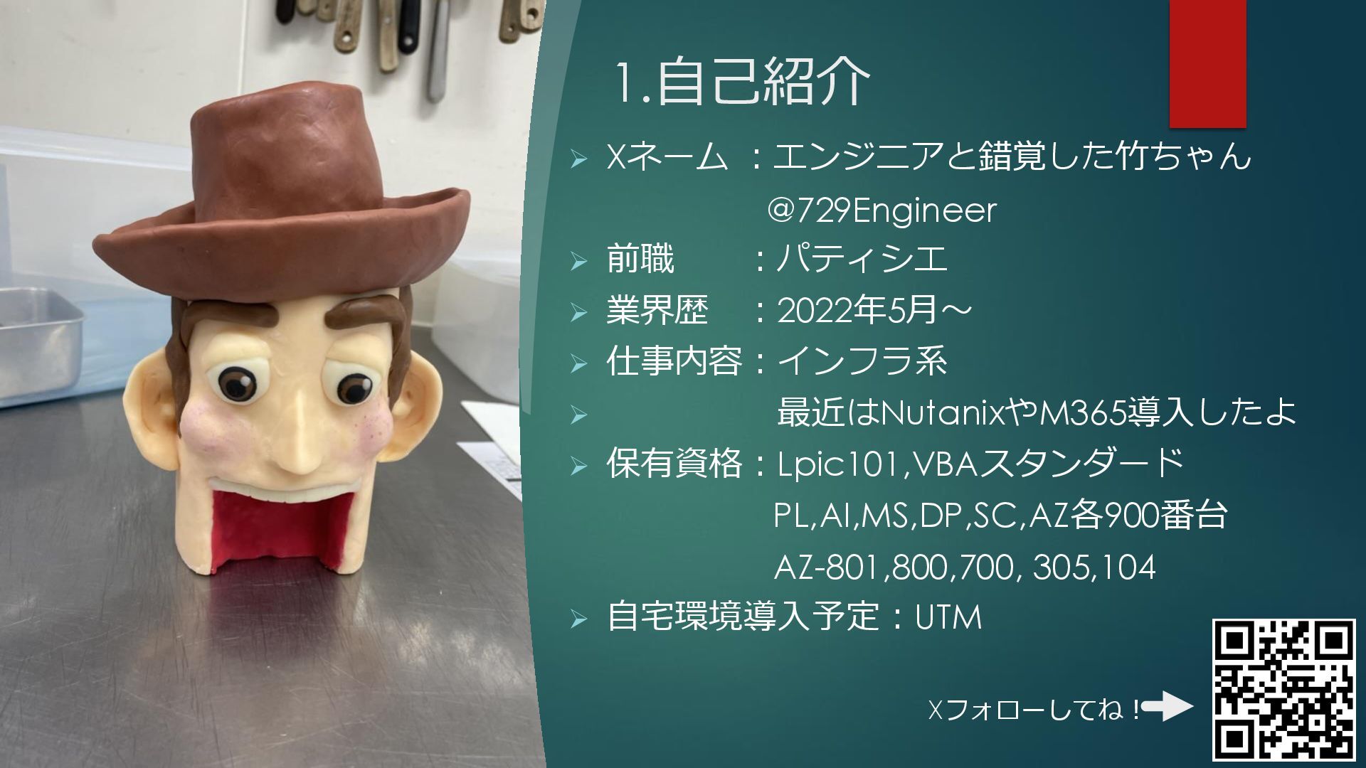 1.自己紹介 ➢ Xネーム :エンジニアと錯覚した竹ちゃん @729Engineer ➢ 前職 :パティシエ ➢ 業界歴