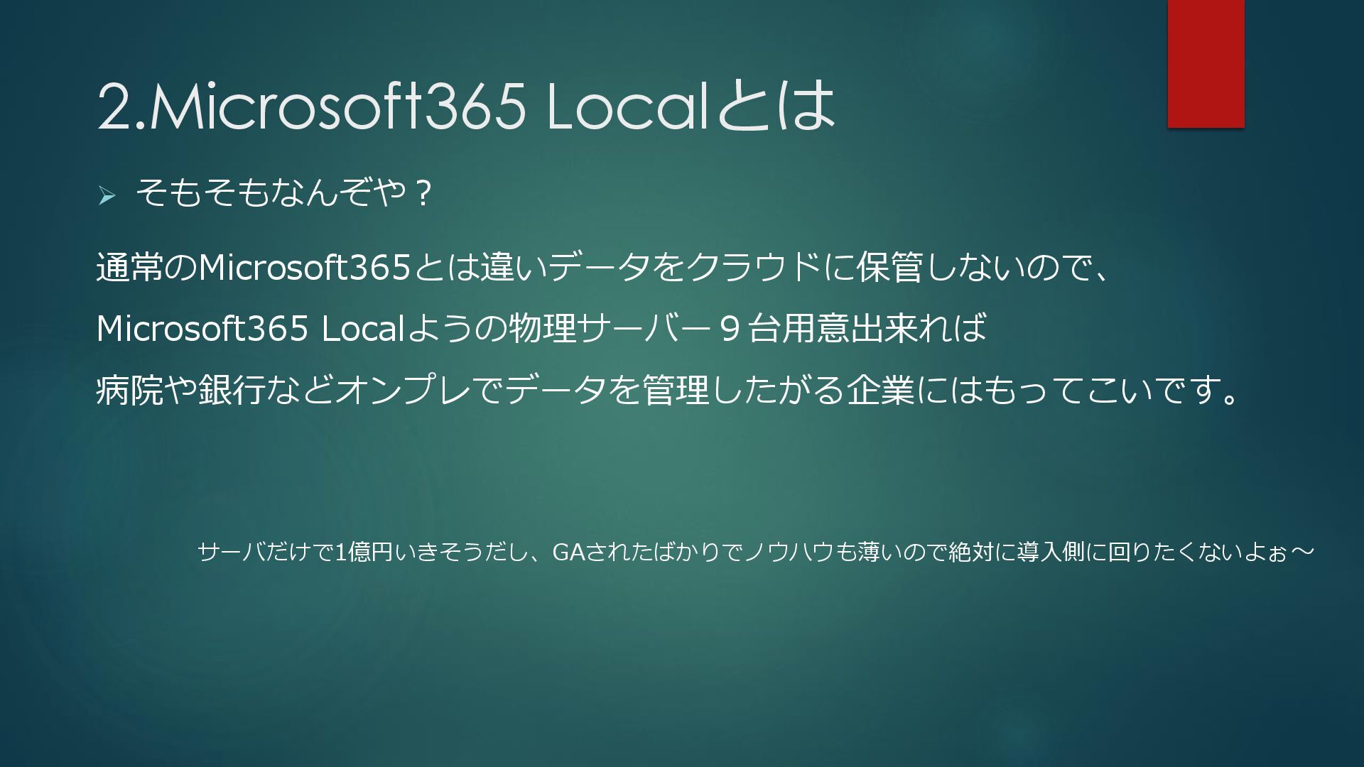 2.Microsoft365 Localとは ➢ そもそもなんぞや? 通常のMicrosoft365とは違いデータをクラウドに保管しないので、 Microsoft365 Localようの物理サーバー9台用意出来れば 病院や銀行などオンプレでデータを管理したがる企業にはもってこいです。 サーバだけで1億円いきそうだし、GAされたばかりでノウハウも薄いので絶対に導入側に回りたくないよぉ〜
