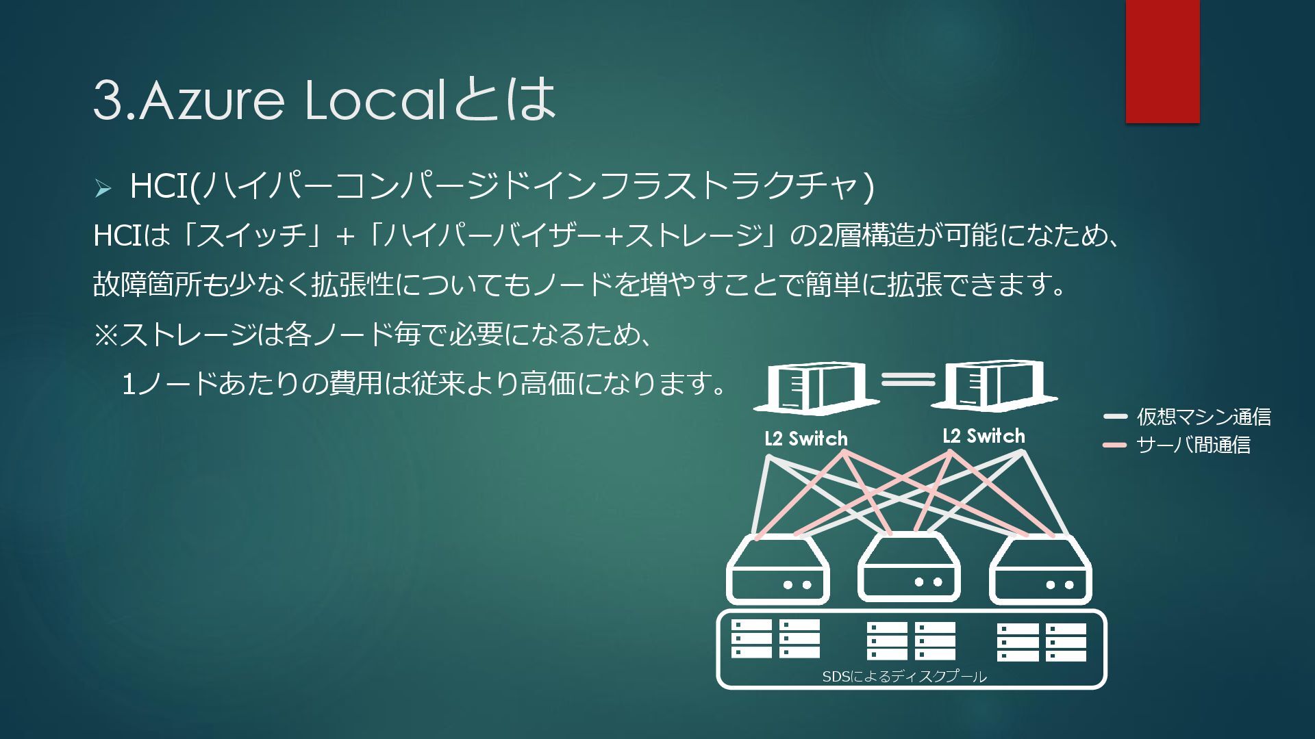 3.Azure Localとは ➢ HCI(ハイパーコンパージドインフラストラクチャ) HCIは「スイッチ」+「ハイパーバイザー+ストレージ」の2層構造が可能になため、 故障箇所も少なく拡張性についてもノードを増やすことで簡単に拡張できます。 ※ストレージは各ノード毎で必要になるため、 1ノードあたりの費用は従来より高価になります。 L2 Switch