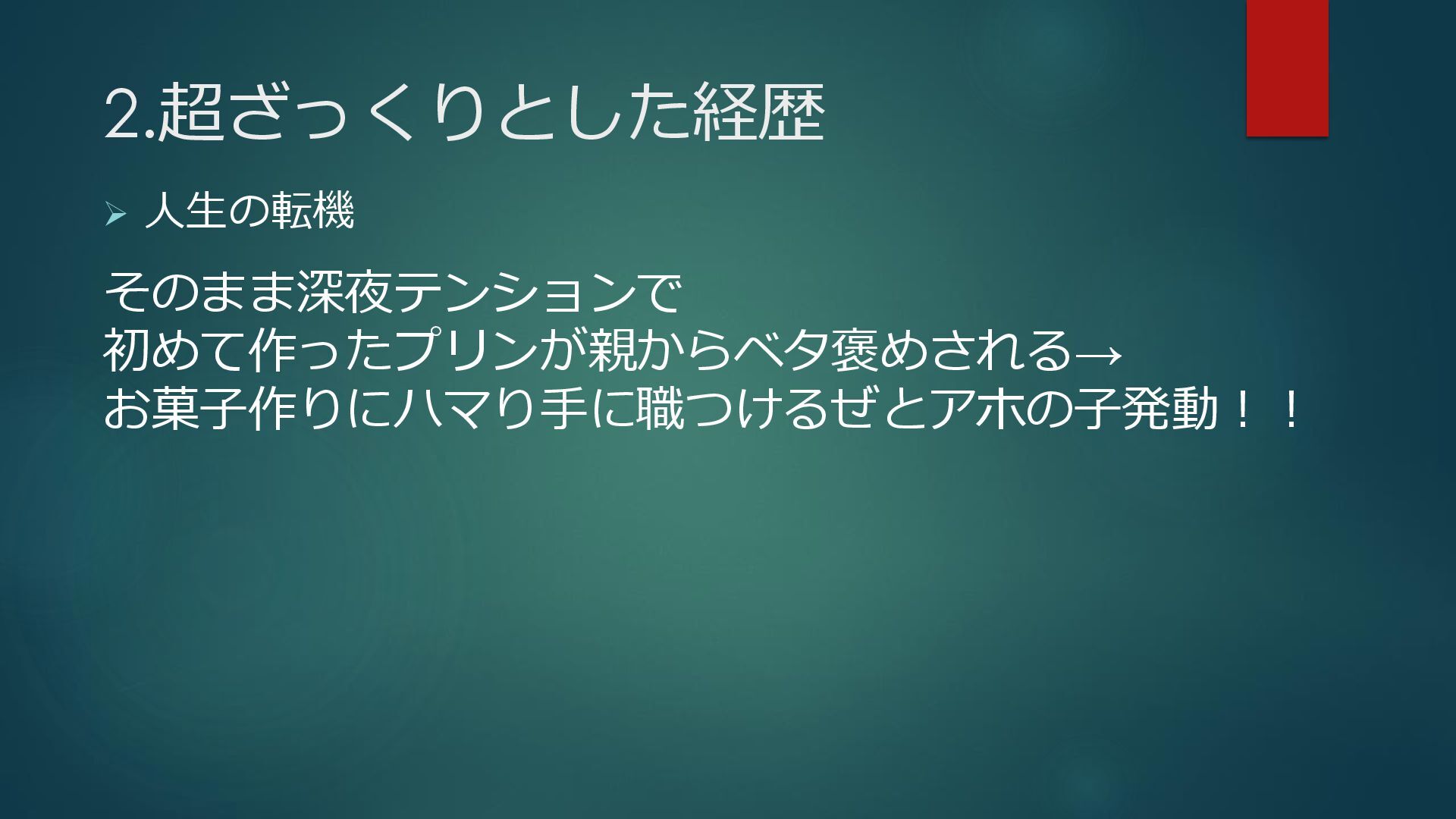 2.超ざっくりとした経歴 ➢ 人生の転機 そのまま深夜テンションで 初めて作ったプリンが親からベタ褒めされる→ お菓子作りにハマり手に職つけるぜとアホの子発動!!