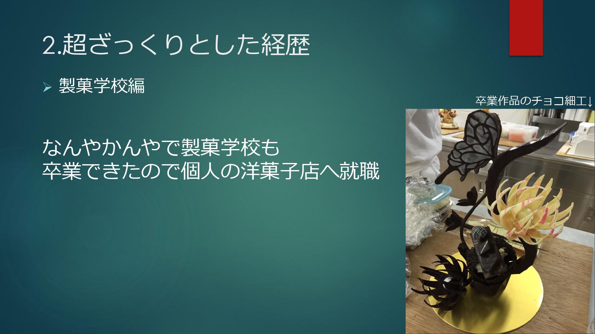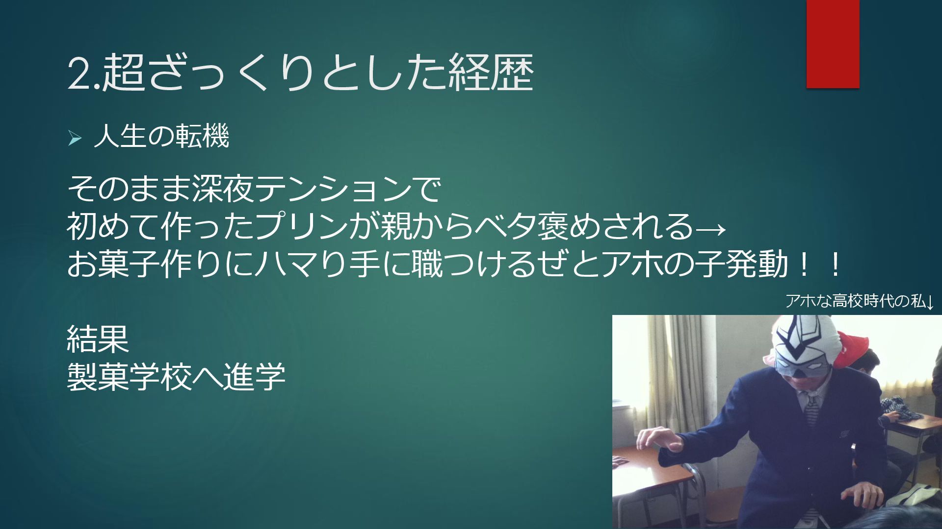 2.超ざっくりとした経歴 ➢ 人生の転機 そのまま深夜テンションで 初めて作ったプリンが親からベタ褒めされる→ お菓子作りにハマり手に職つけるぜとアホの子発動!! 結果 製菓学校へ進学 アホな高校時代の私↓