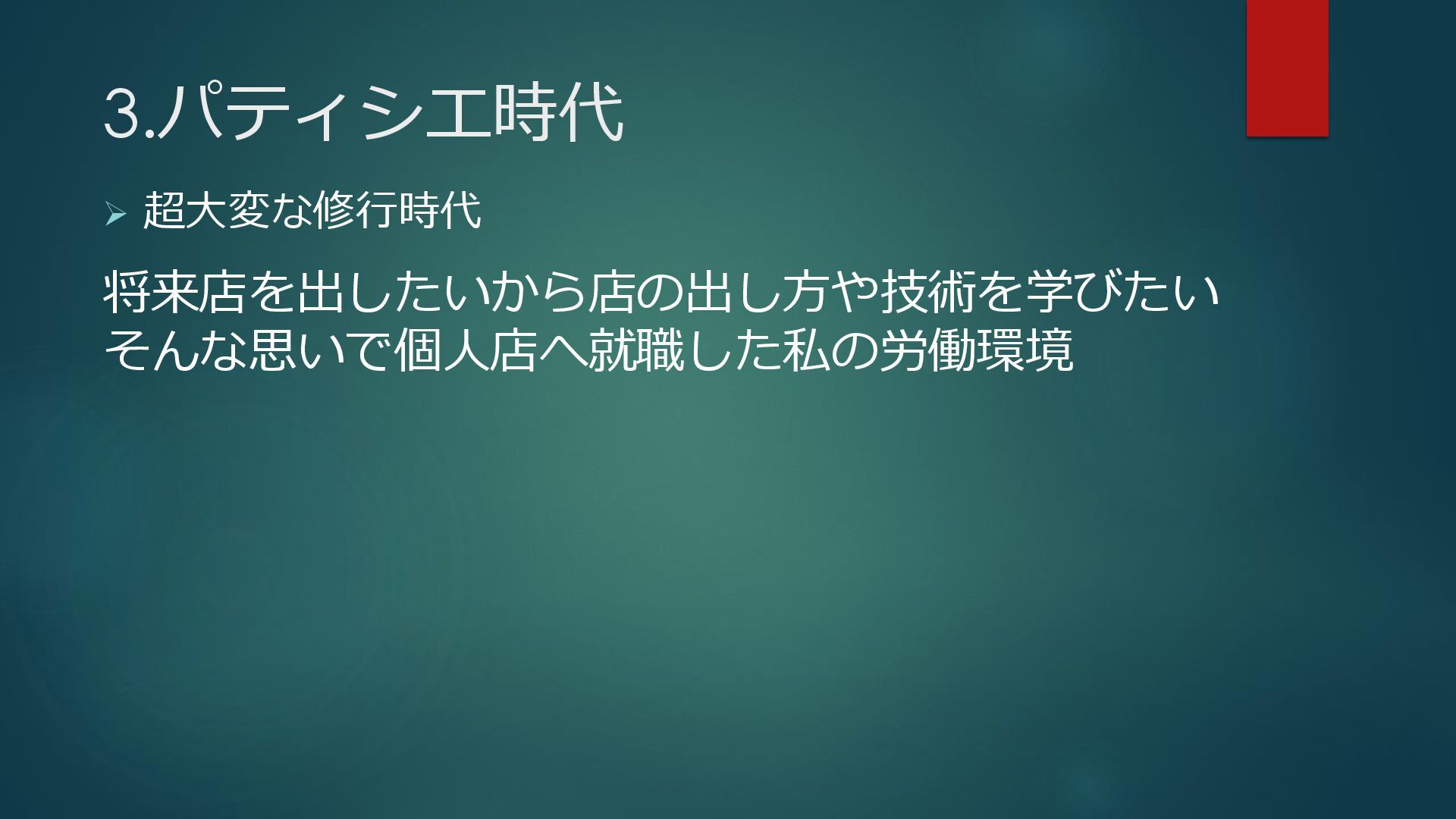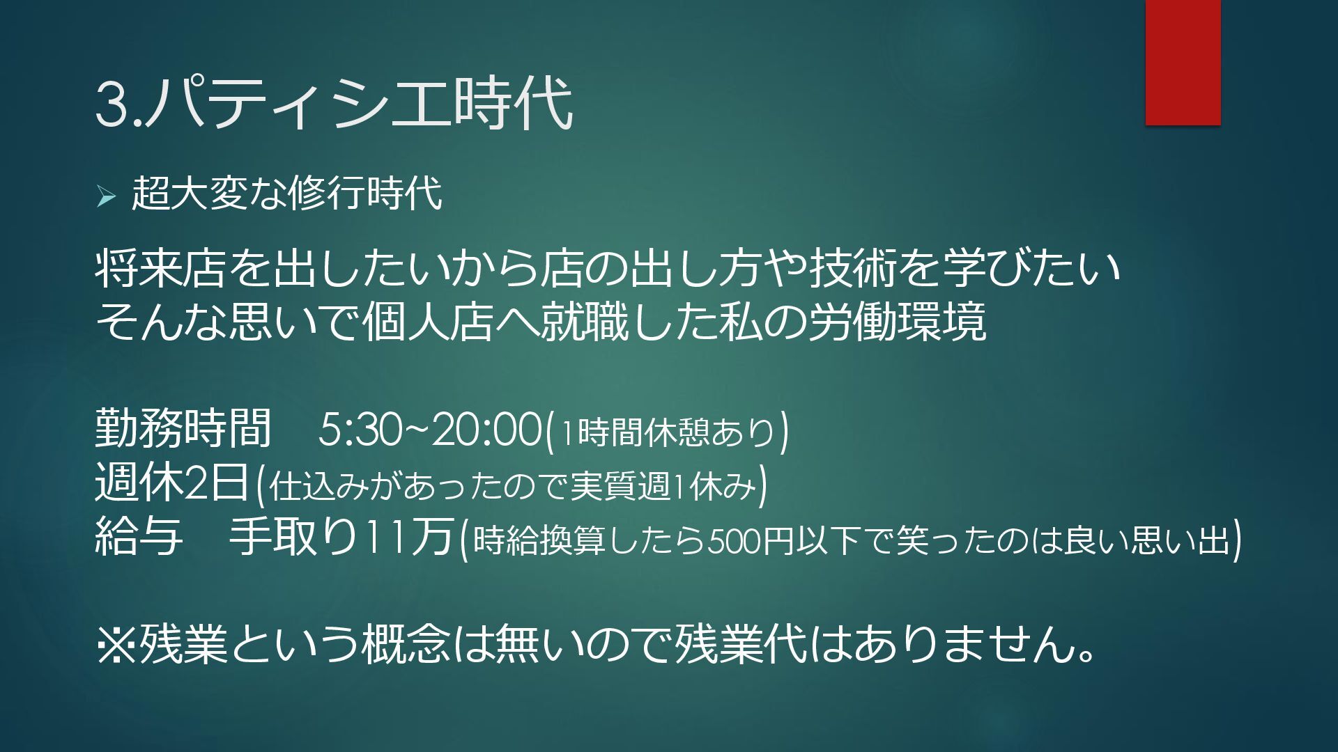 3.パティシエ時代 ➢ 超大変な修行時代 将来店を出したいから店の出し方や技術を学びたい そんな思いで個人店へ就職した私の労働環境