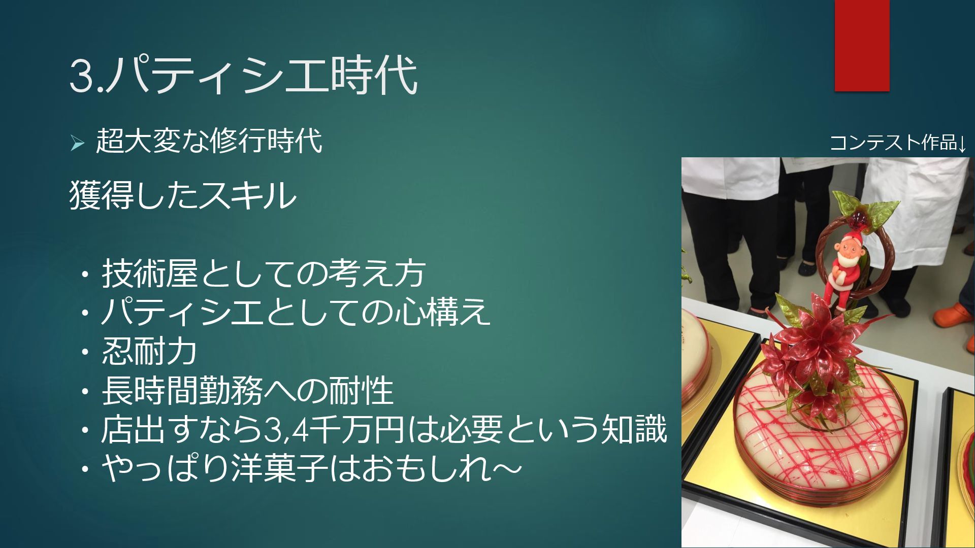 3.パティシエ時代 ➢ 超大変な修行時代 獲得したスキル ・技術屋としての考え方 ・パティシエとしての心構え ・忍耐力 ・長時間勤務への耐性 ・店出すなら3,4千万円は必要という知識 ・やっぱり洋菓子はおもしれ~