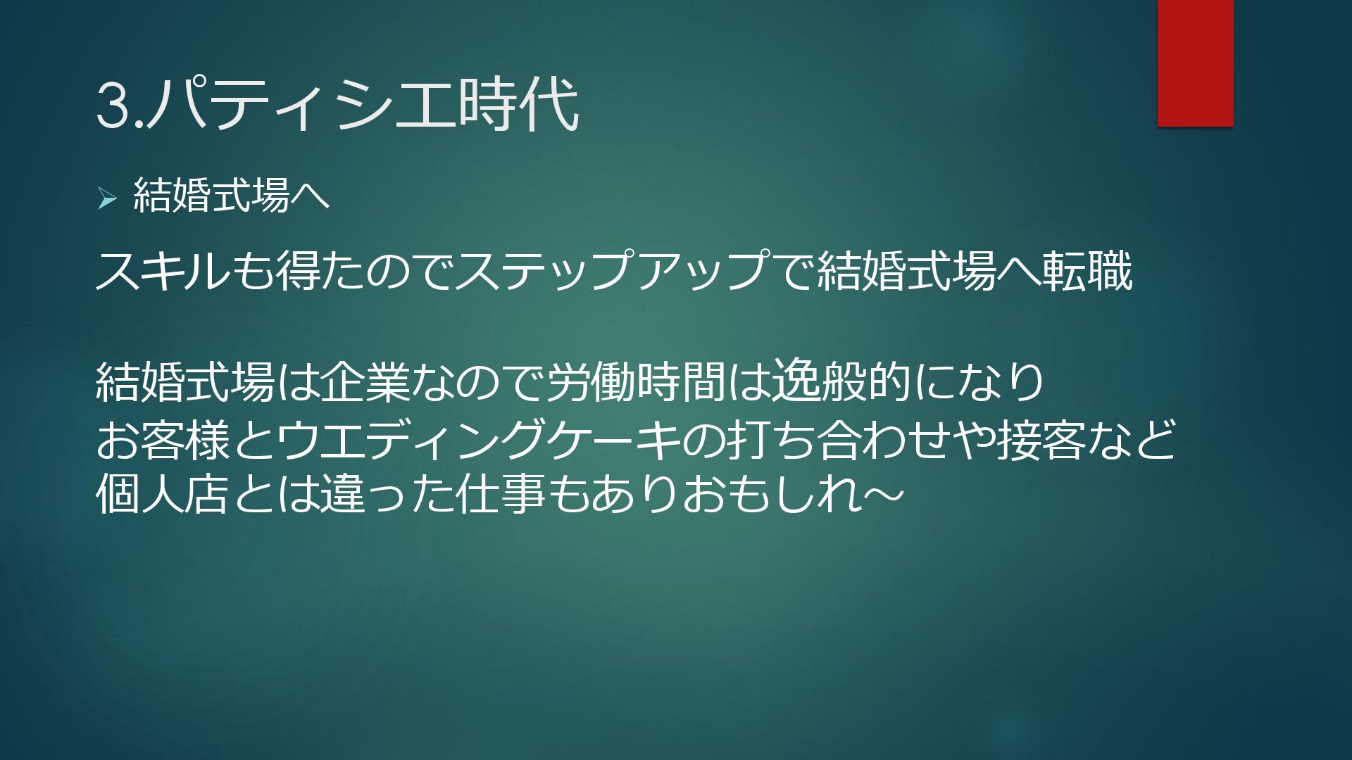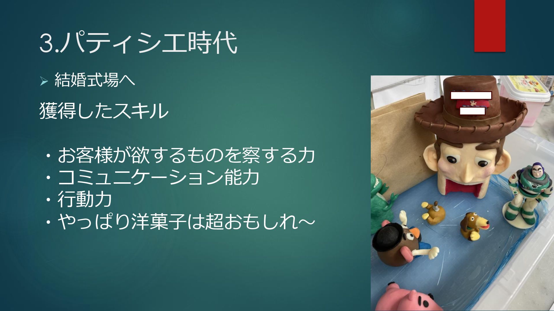 3.パティシエ時代 ➢ 結婚式場へ 獲得したスキル ・お客様が欲するものを察する力 ・コミュニケーション能力 ・行動力 ・やっぱり洋菓子は超おもしれ~