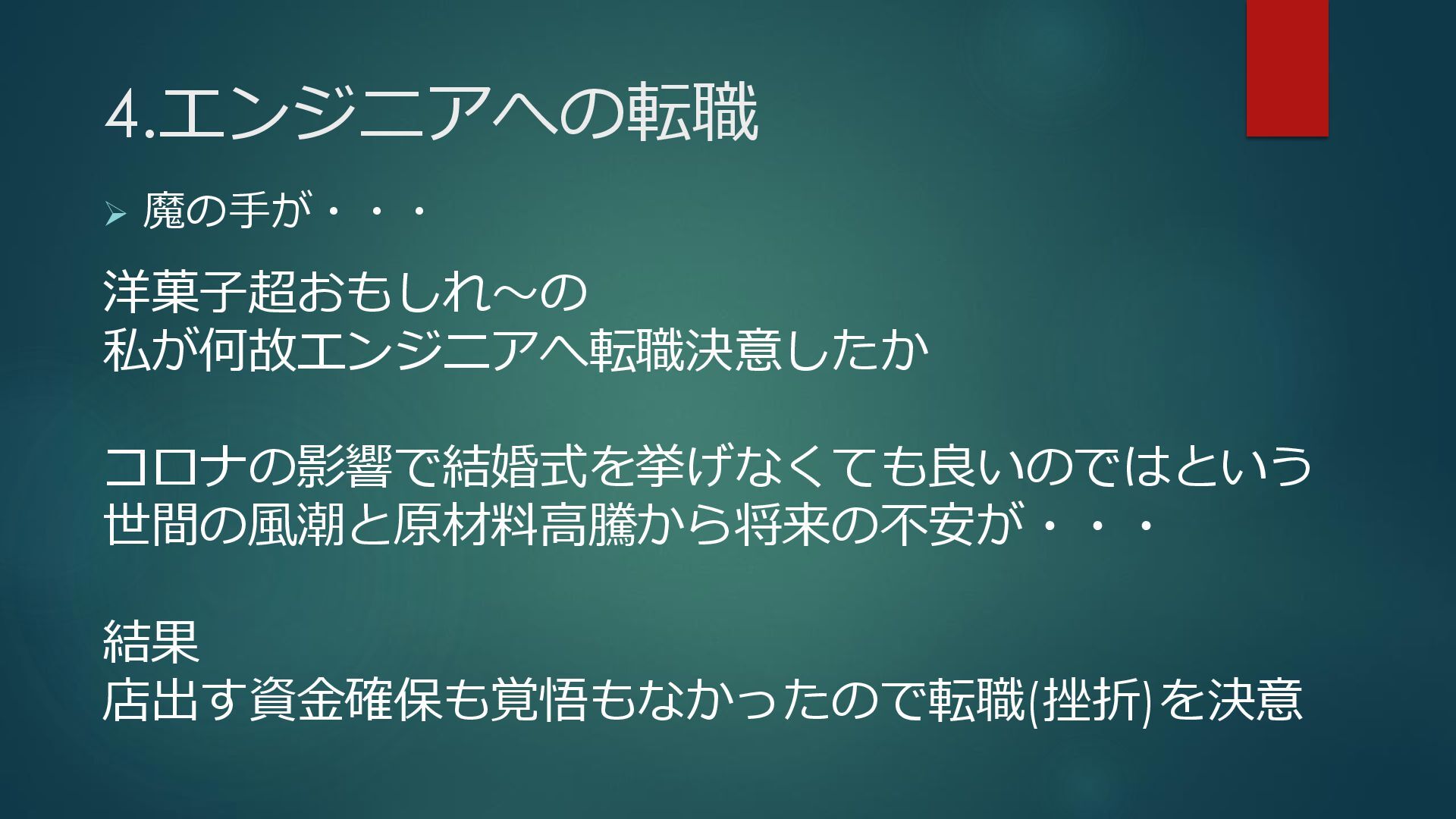 4.エンジニアへの転職 ➢ 魔の手が・・・ 洋菓子超おもしれ~の 私が何故エンジニアへ転職決意したか コロナの影響で結婚式を挙げなくても良いのではという 世間の風潮と原材料高騰から将来の不安が・・・ 結果 店出す資金確保も覚悟もなかったので転職(挫折)を決意