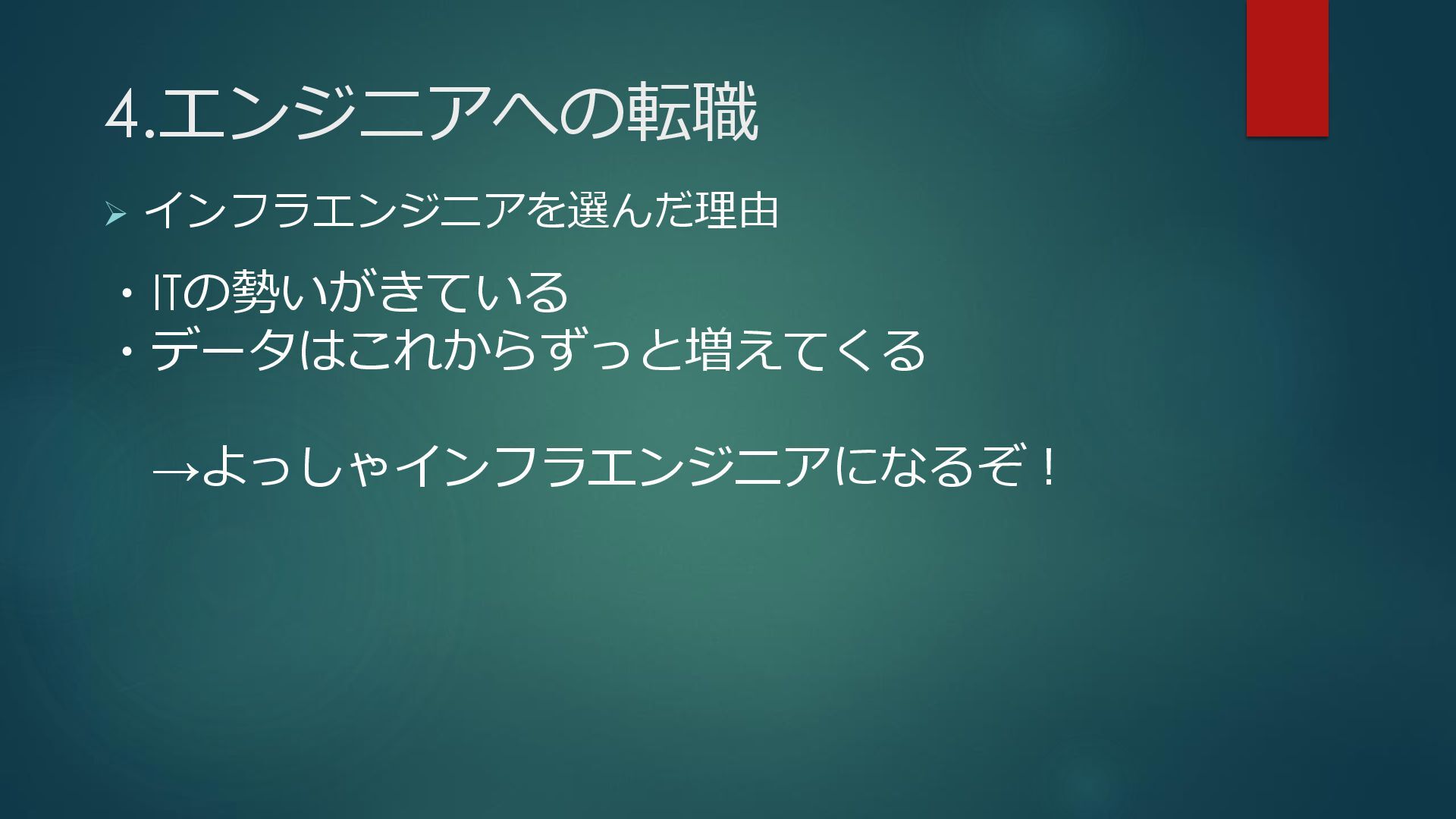4.エンジニアへの転職 ➢ インフラエンジニアを選んだ理由 ・ITの勢いがきている ・データはこれからずっと増えてくる →よっしゃインフラエンジニアになるぞ!