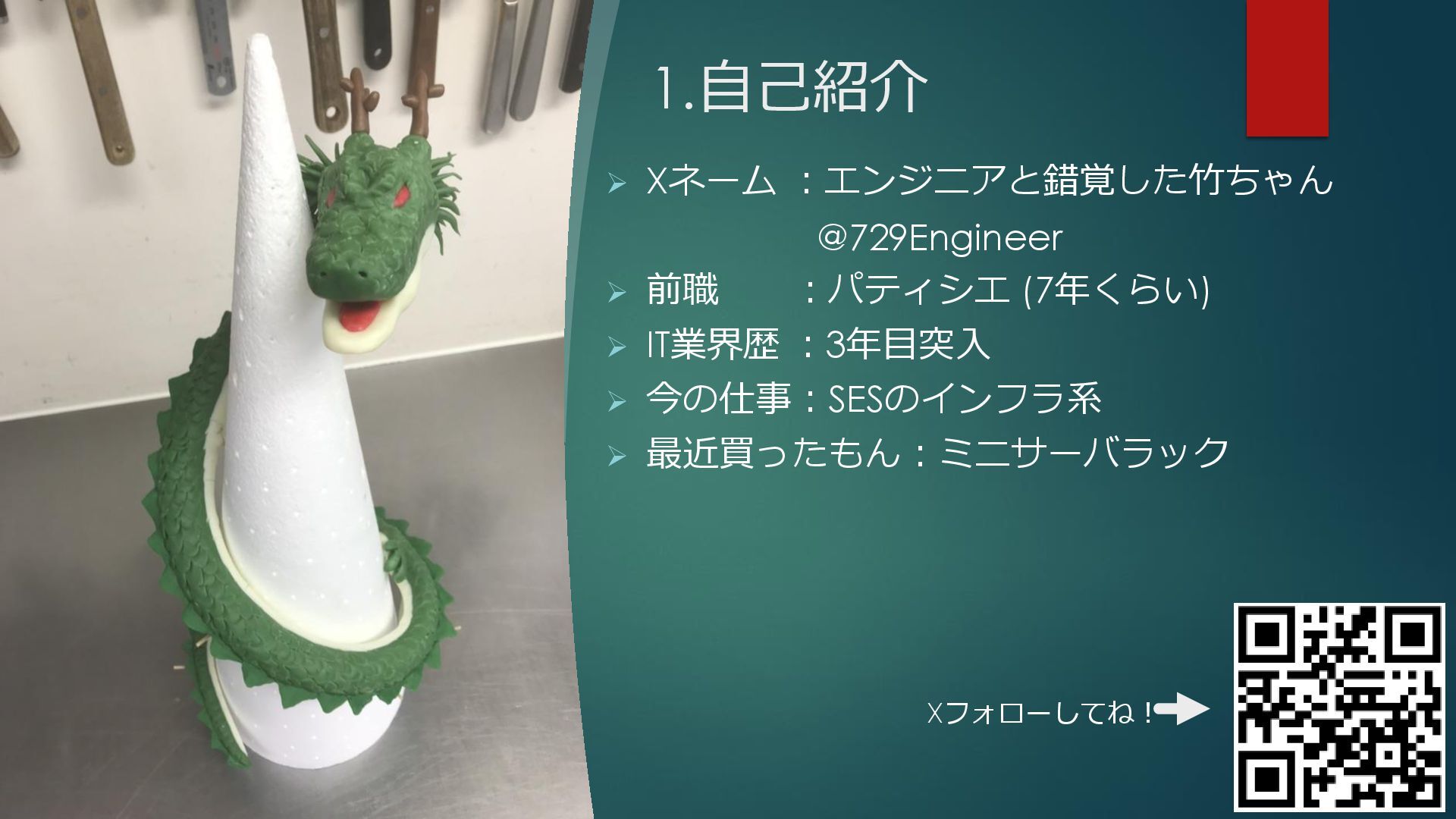 1.自己紹介 ➢ Xネーム :エンジニアと錯覚した竹ちゃん @729Engineer ➢ 前職 :パティシエ (7年くらい) ➢