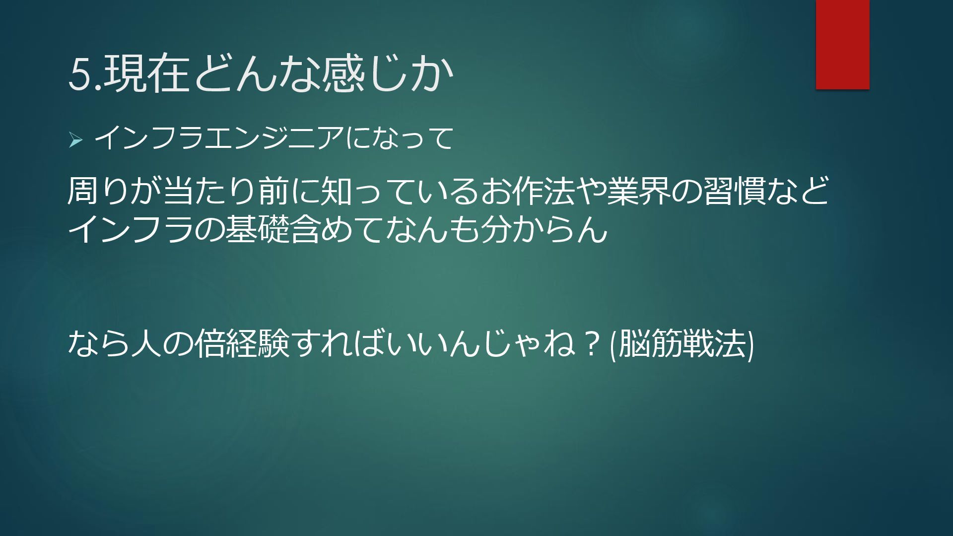 5.現在どんな感じか ➢ インフラエンジニアになって 周りが当たり前に知っているお作法や業界の習慣など インフラの基礎含めてなんも分からん なら人の倍経験すればいいんじゃね?(脳筋戦法)